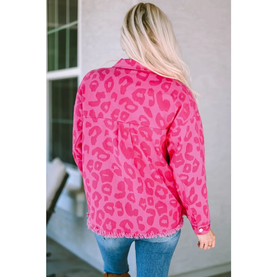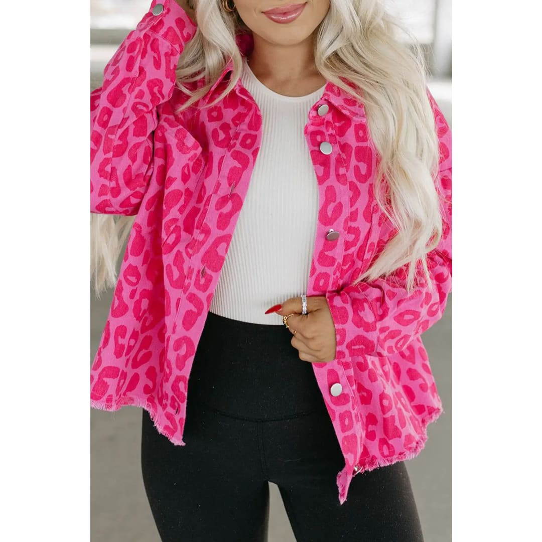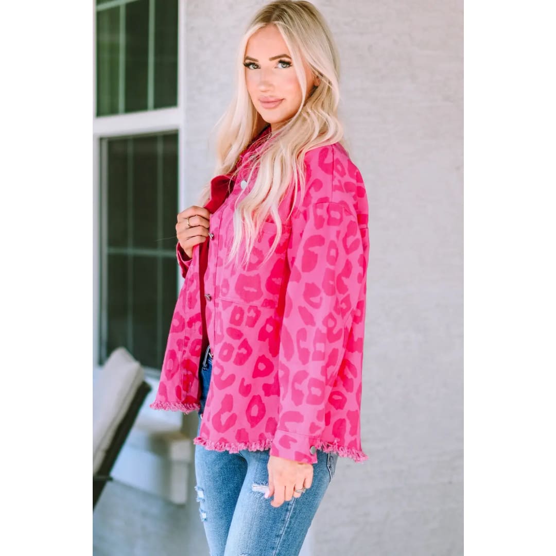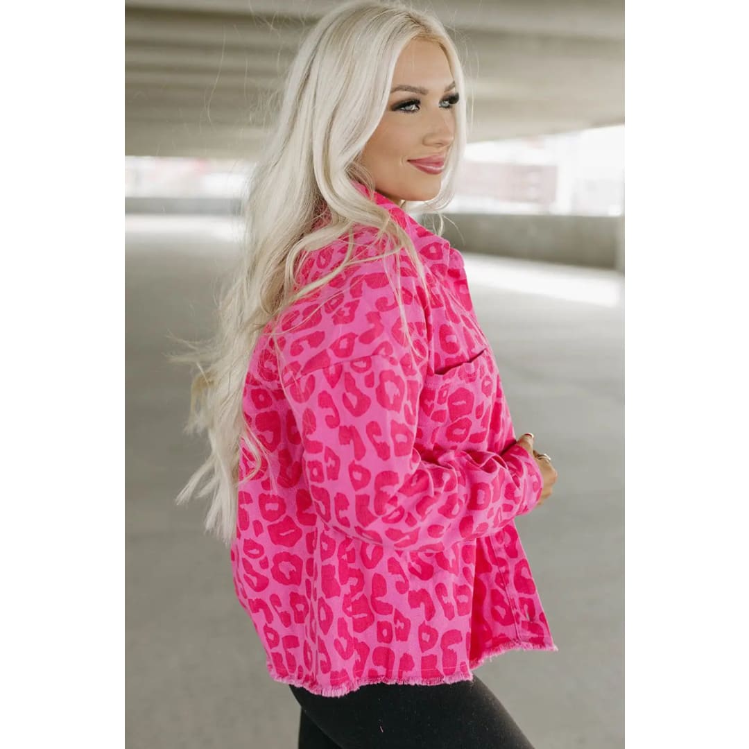 Pink Leopard Print Button Cuffs Raw Hem Jacket