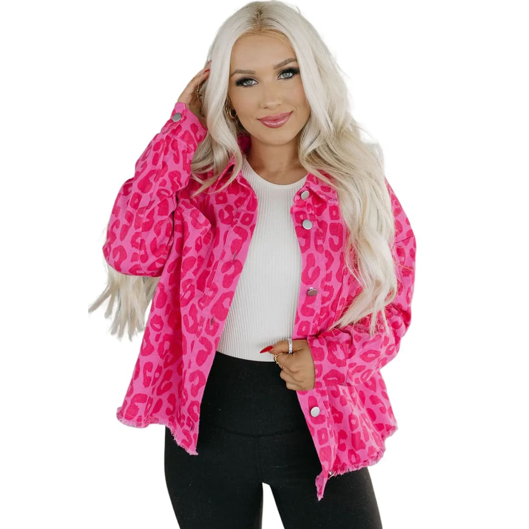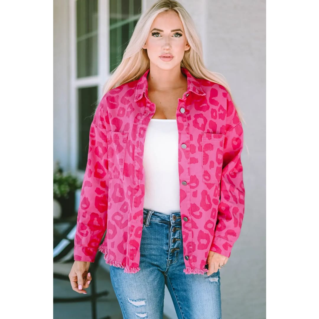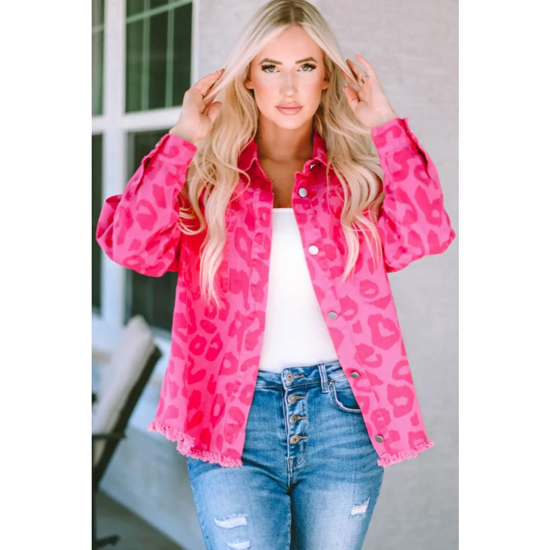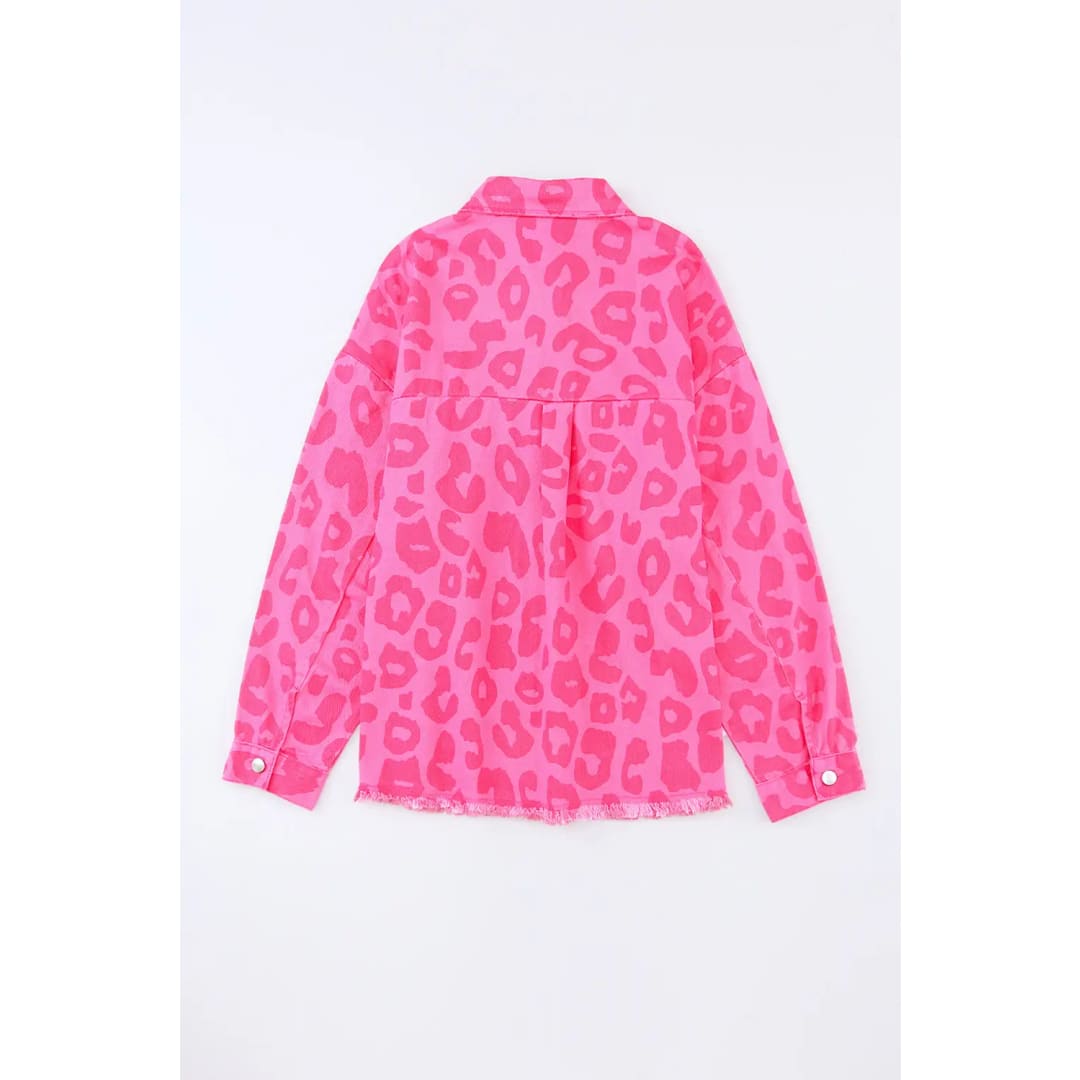 Pink Leopard Print Button Cuffs Raw Hem Jacket