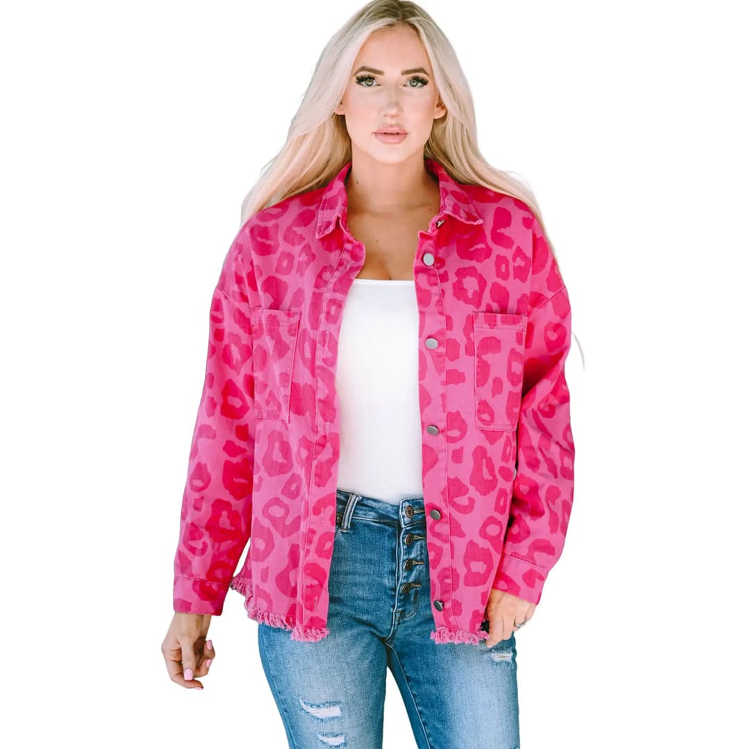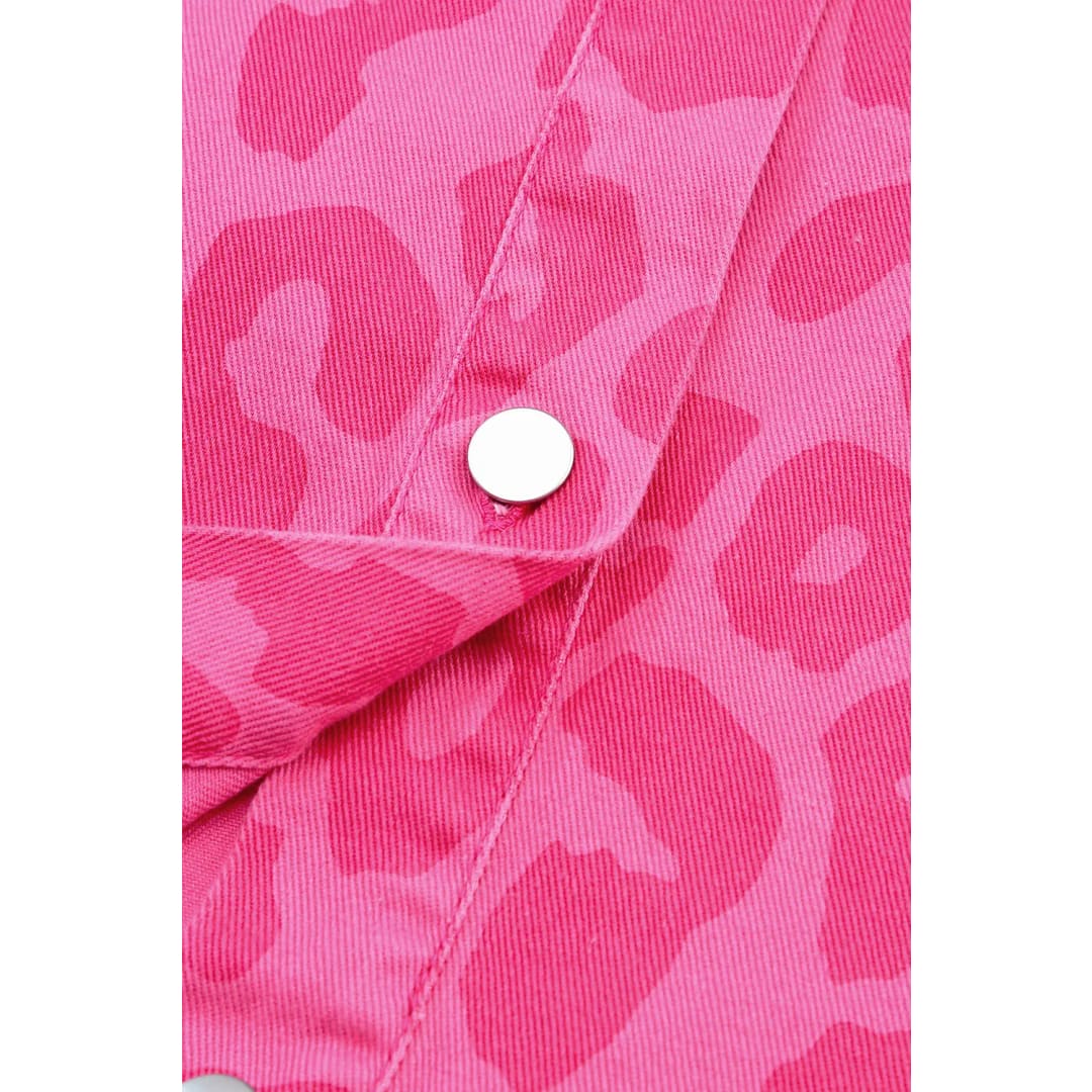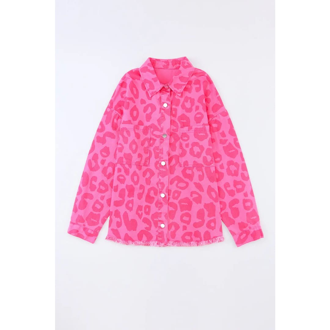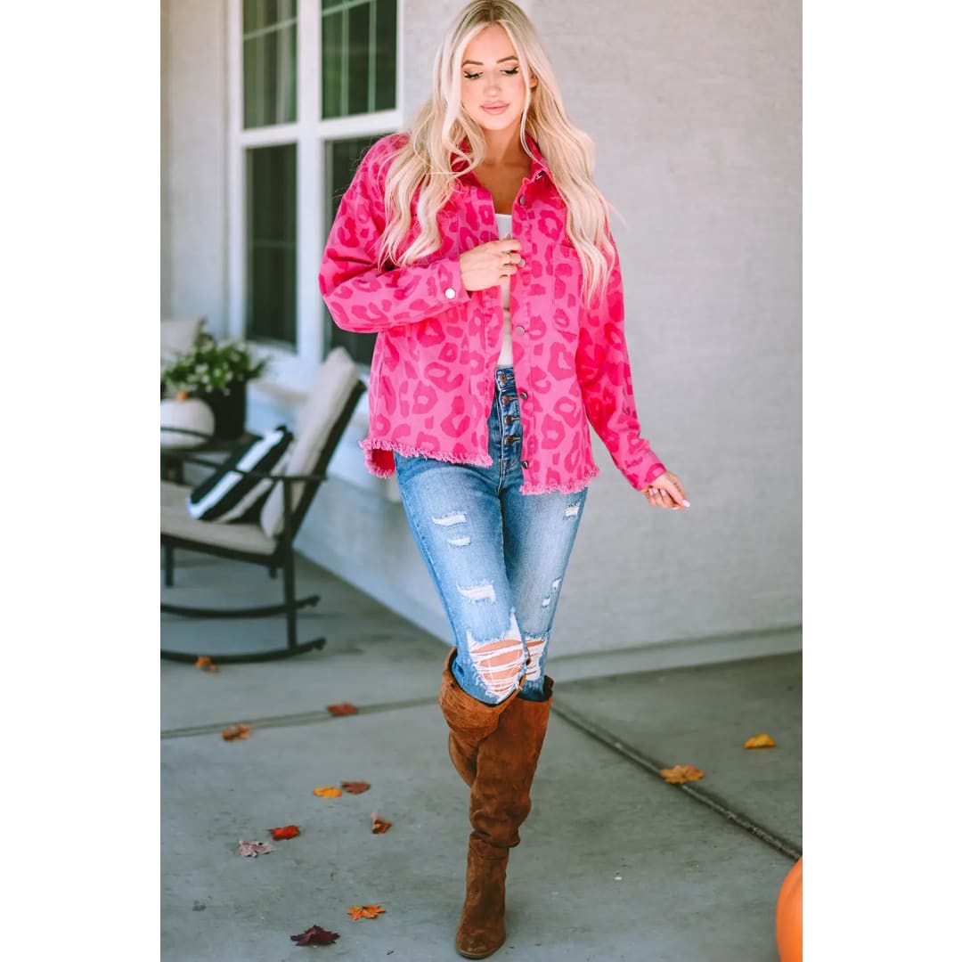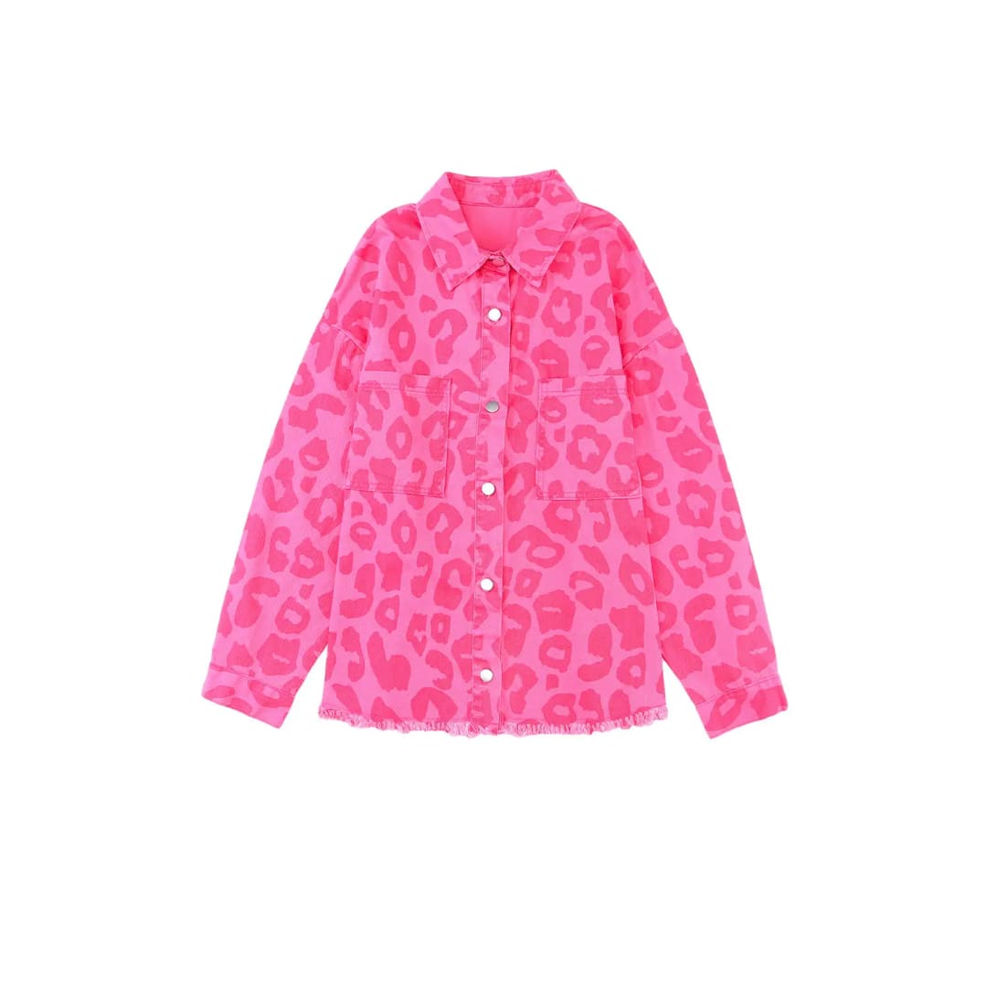 Pink Leopard Print Button Cuffs Raw Hem Jacket