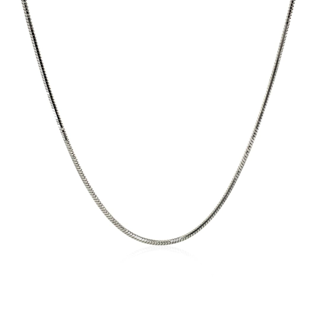 This classic rhodium plated chain is crafted in gleaming sterling silver and has a width of 1.2 millimeters featuring a snake chain design is secured with a lobster clasp.