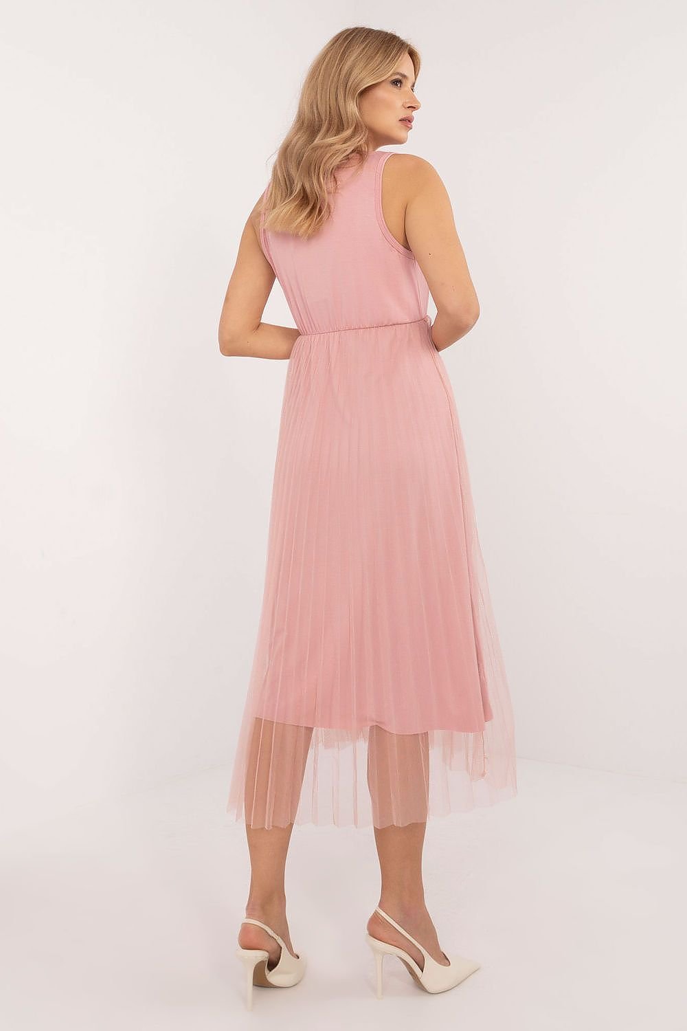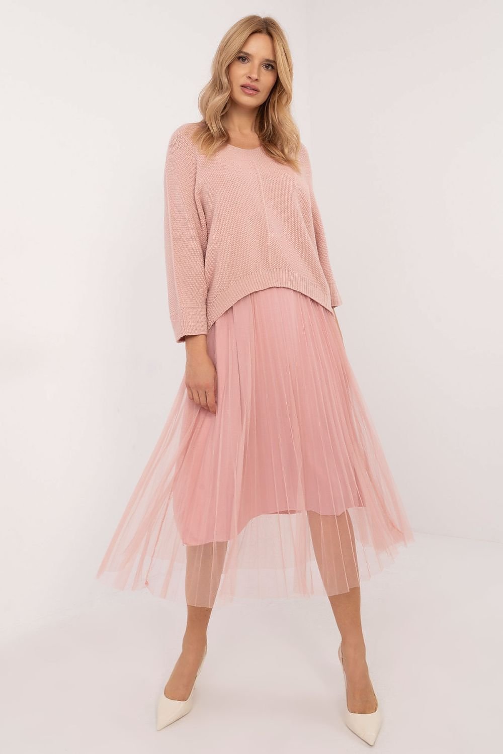 Set consisting of an elegant sweater and a dress, perfect for everyday wear, work, and formal occasions. The midi-length dress is made of high-quality material with a varied texture, adding a unique character to the outfit. The model is equipped with a lining, providing comfort and an elegant look. Both the dress and the sweater have a subtle round neckline. The sweater has long sleeves, which is perfect for cooler days. This combination of style and comfort will emphasize your class in everyday and formal situations. Composition: Dress: Outer: 100% polyester Lining: 95% viscose, 5% elastane Sweater: 50% viscose, 31% polyamide, 19% nylon