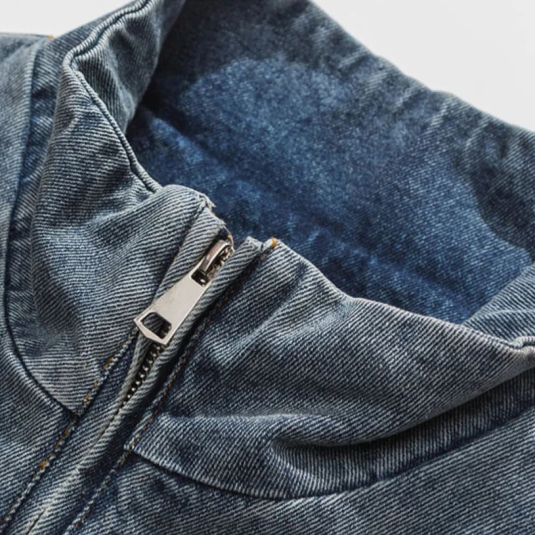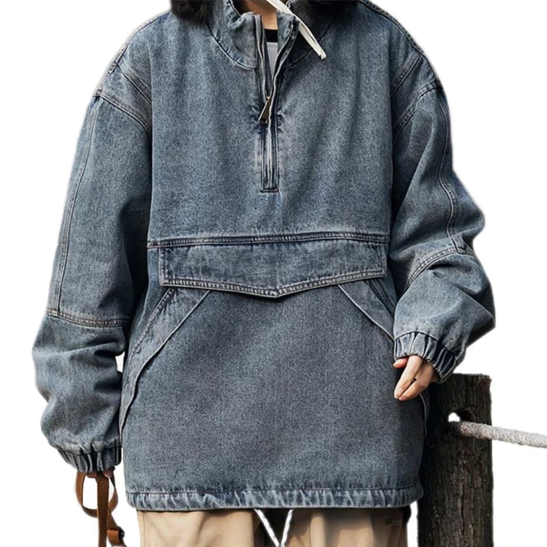 Urban Retro Denim Pullover with Stand Collar and Half-Zip Closure