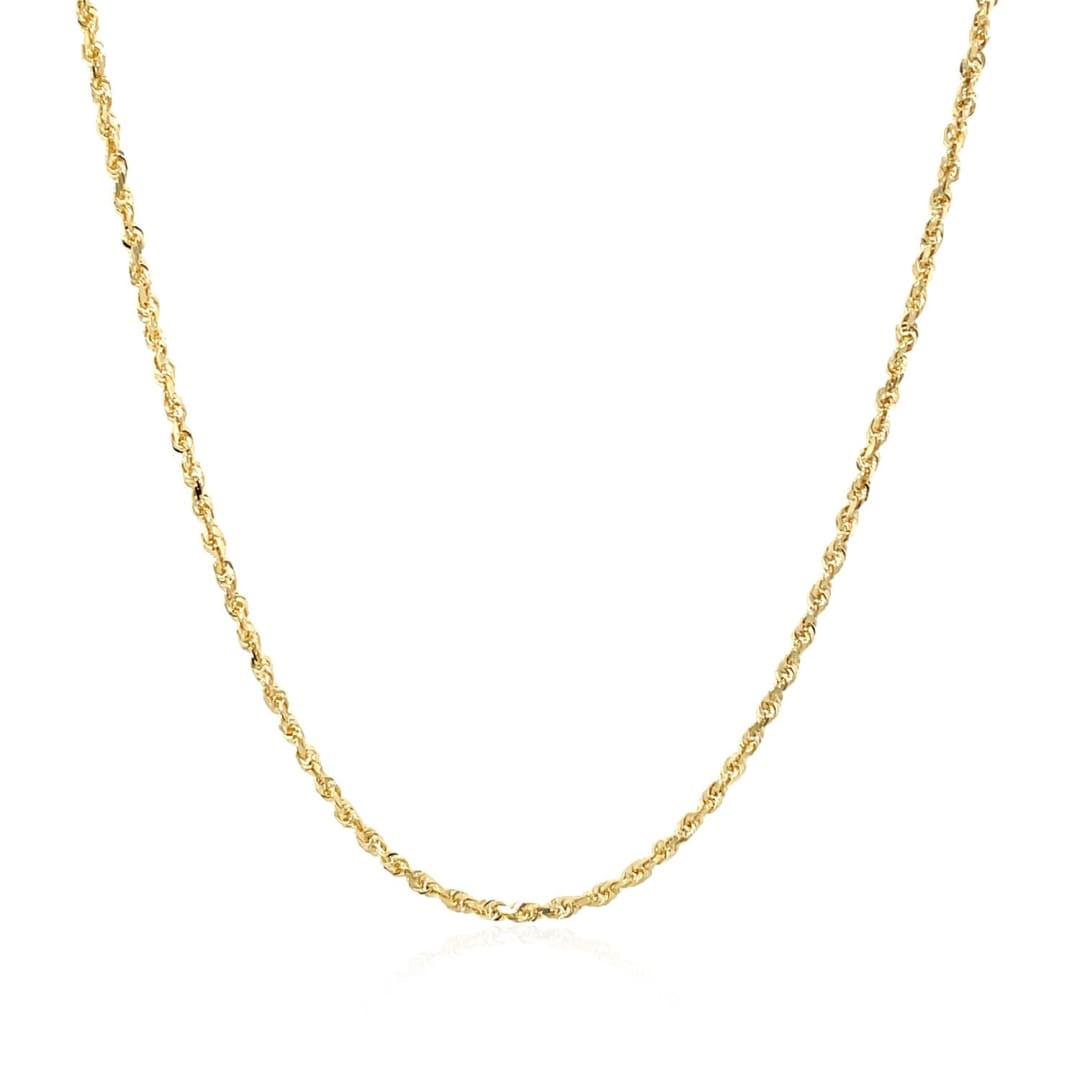 This solid diamond cut rope chain comes in 14k yellow gold and has a width of 1.25 millimeters.