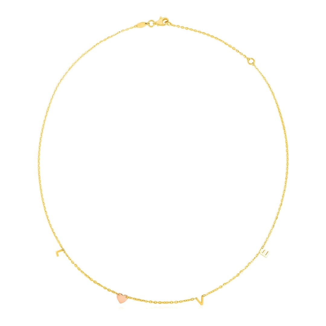 This necklace's message of incheslove inches joins the classic beauty of yellow 14k yellow gold with a sweetly highlighted heart in rose gold. Necklace is 18 inches long and closes with a lobster clasp.