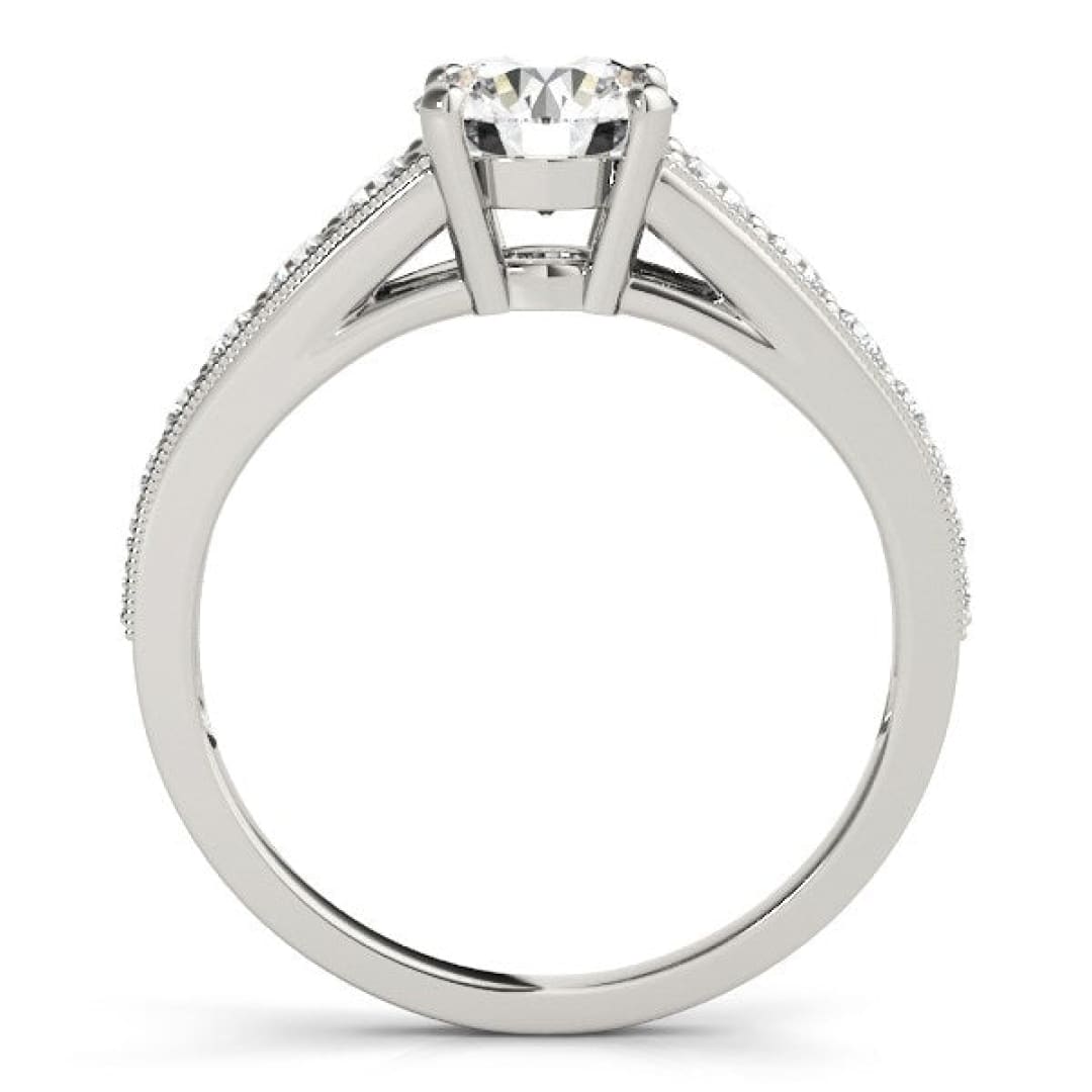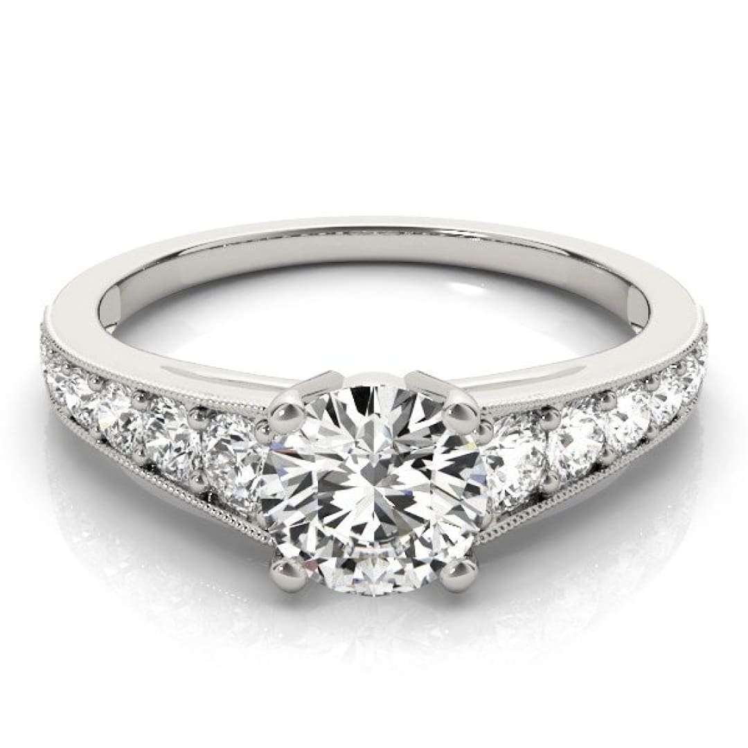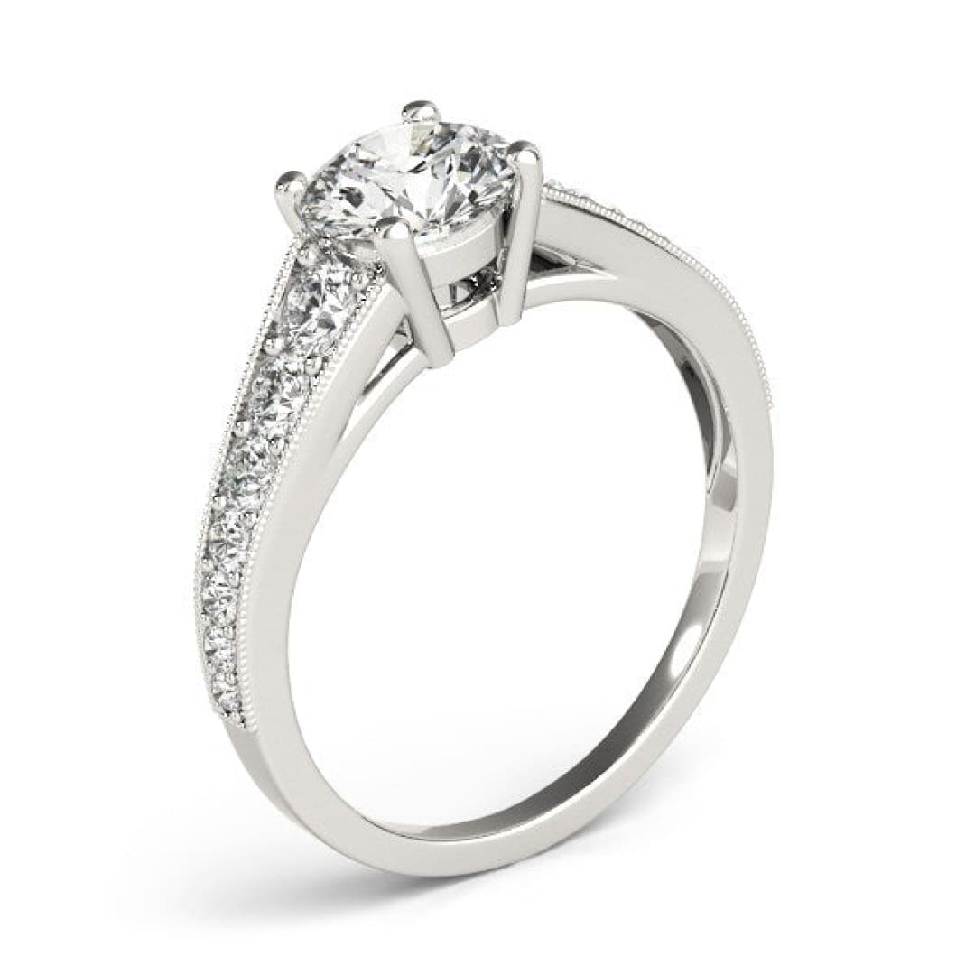 An alluring round prong set diamond ring with an antique-inspired style. Showcasing a tapered shank with bead set single row stones and milgrain detailing, this beauty is made of 14k white gold.