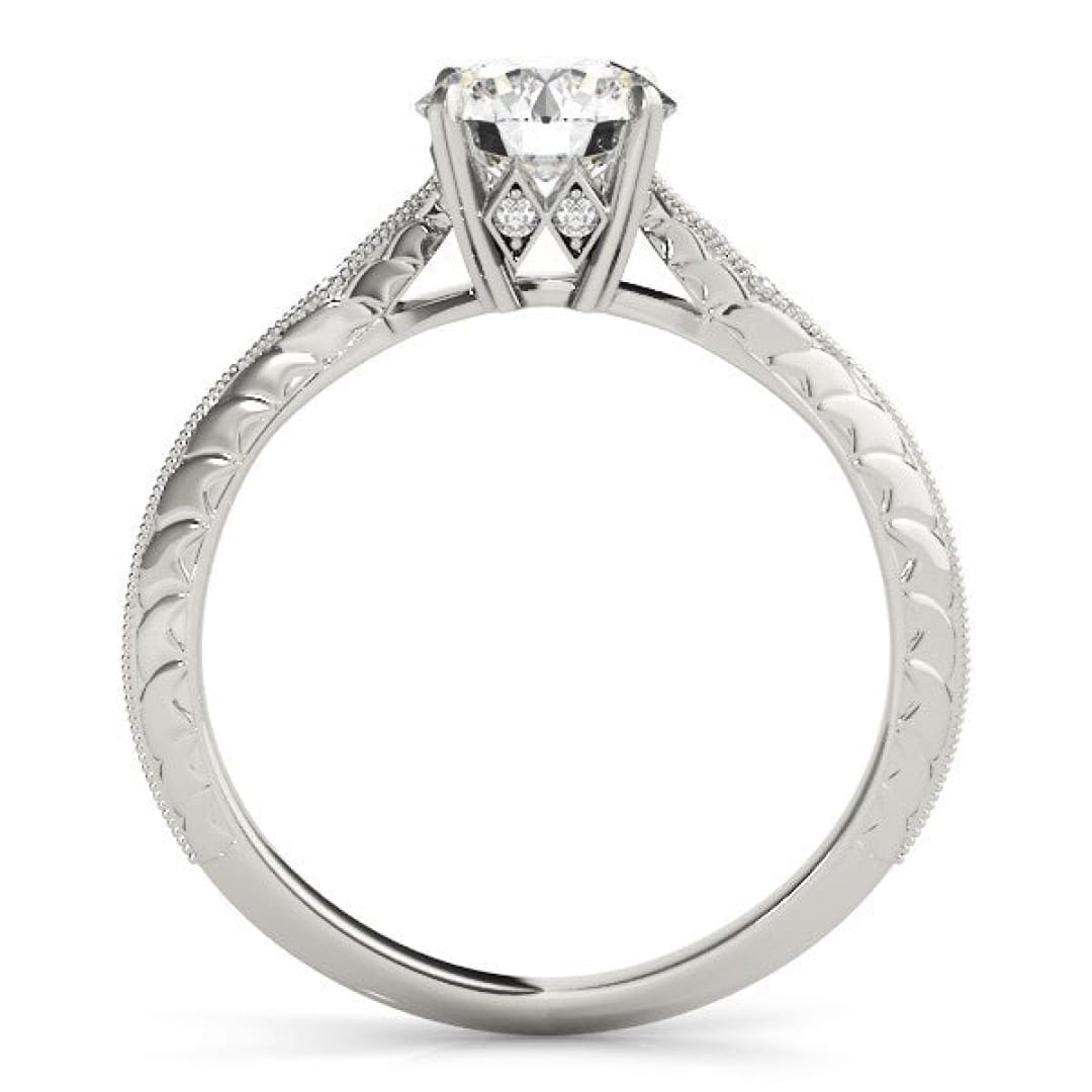 Showcasing an antique style, this round prong set diamond ring features side cluster stones encased in bead border detailing. Gorgeous in 14k white gold.