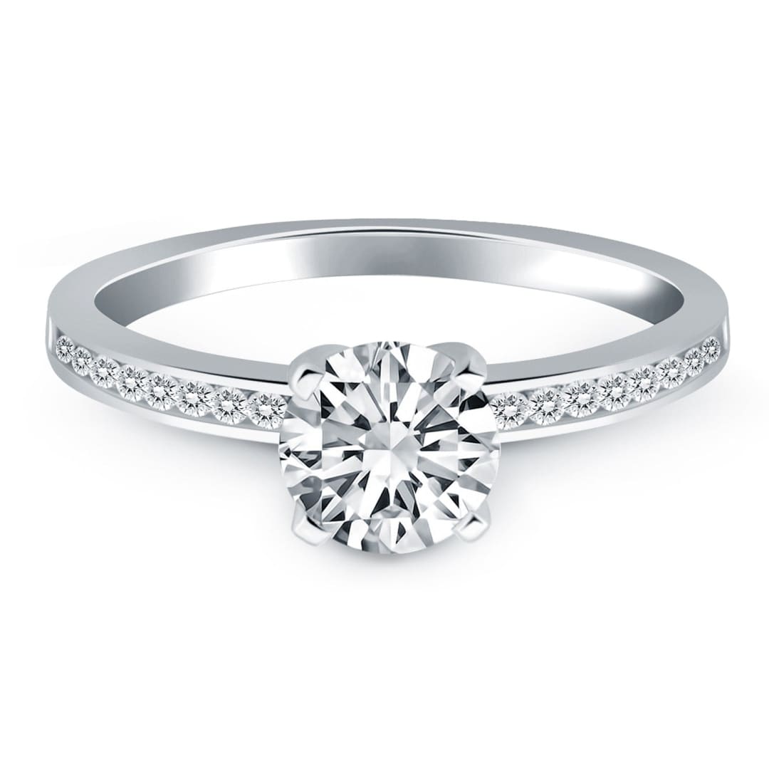 A glittering row of channel set diamonds extends halfway around the band enlivens this slender 14k white gold engagement ring. The center highlights a sparkling 1/2 carat round cut diamond.