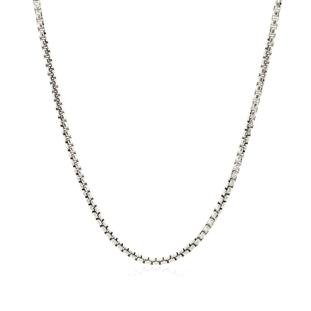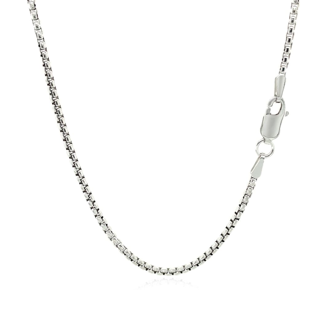 This round box chain comes in 14k white gold and has a width of 1.7 millimeters.