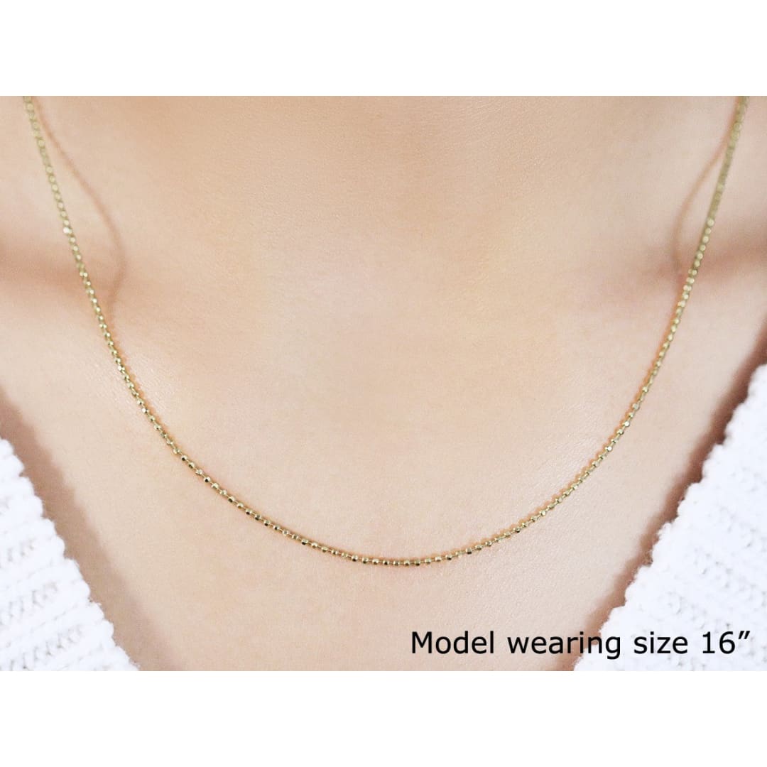 This diamond cut bead chain comes in 14k yellow gold and has a width of 1.2 millimeters.