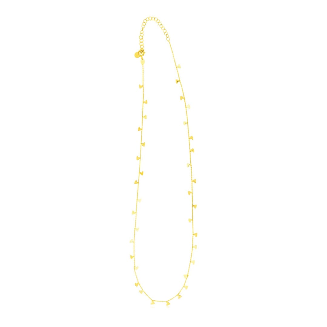 A collection of sweet, polished hearts dangle and dance from fine chain in this unique 14K yellow gold necklace. Necklace is 18 inches long, 0.6mm wide, and closes with a spring ring clasp. Heart elements measure 3.3mm.