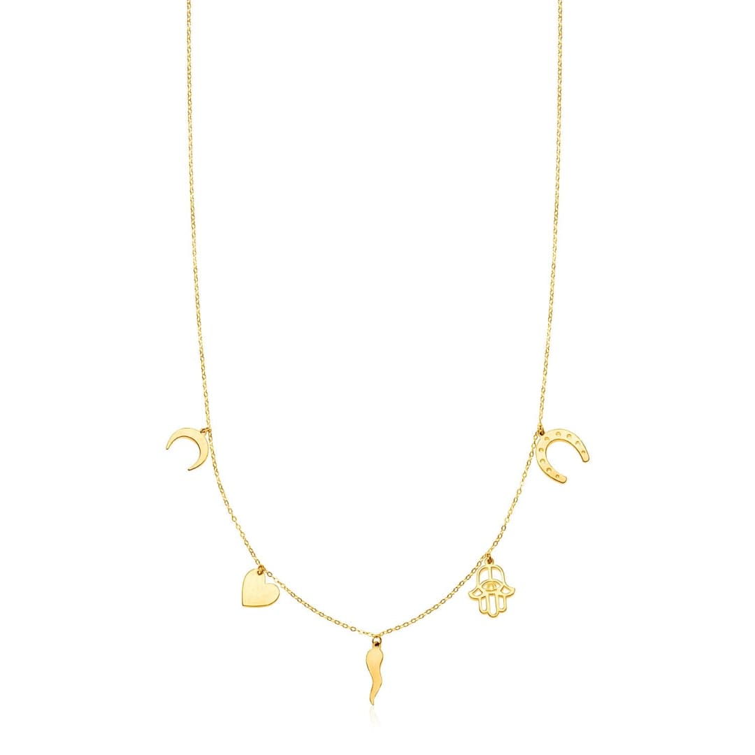 The lovely charms of this eye-catching 14K yellow gold bracelet capture celestial themes and hopes of luck and prosperity. Necklace is 18 inches long and closes with a spring ring clasp.