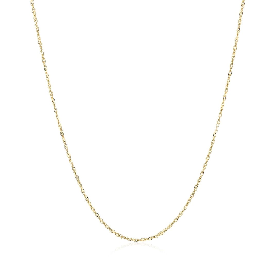 This Singapore chain comes in 14k yellow gold and has a width of 0.8 millimeters.