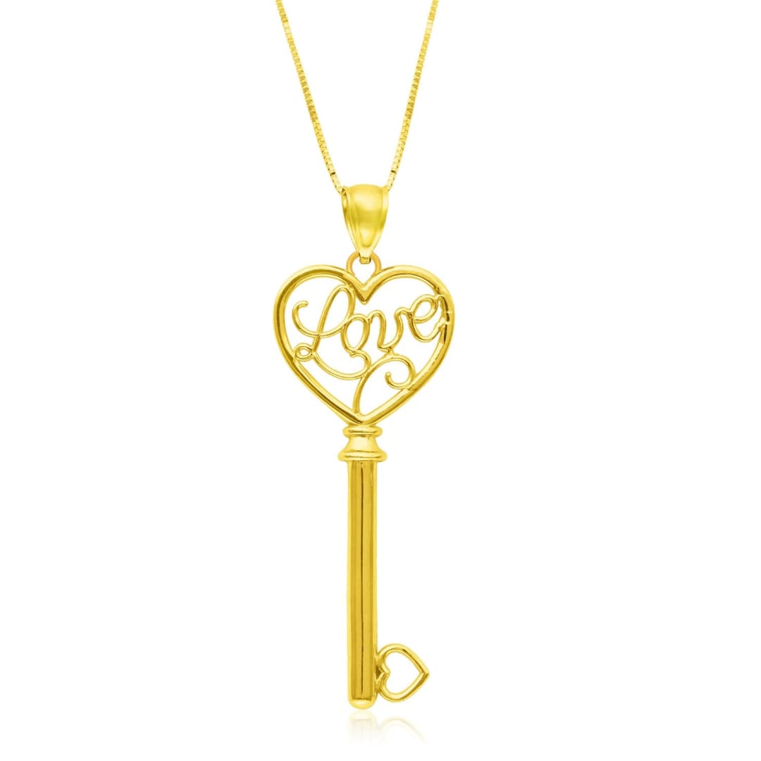 Stunningly adorable, this classic skeleton key style pendant showcases an exquisite LOVE design. Made of 14k yellow gold, this beauty boasts of heart shape detailing.