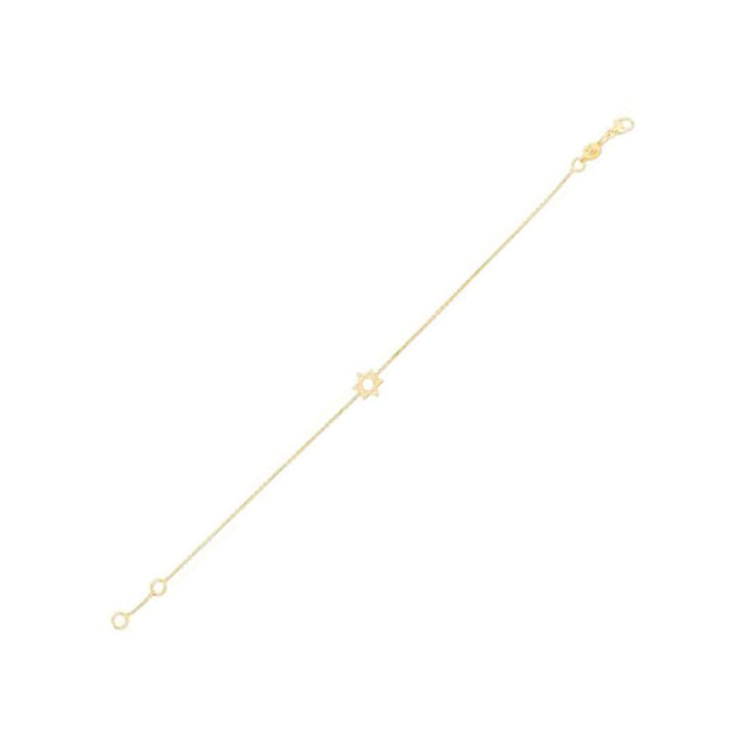 This beautiful 14k yellow gold Star of David bracelet comes in a high polish finish & closes with a lobster clasp. This stunning piece is hand crafted & sits effortlessly between a glimmering rolo chain. Uniquely balanced in the center is a beautiful Star of David that adds that unique touch to your collection. Measuring 7 inches in length.