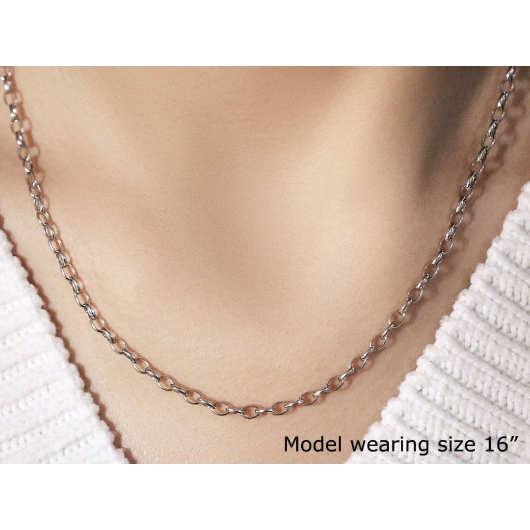 This oval rolo chain comes in 14k white gold and has a width of 3.2 millimeters.