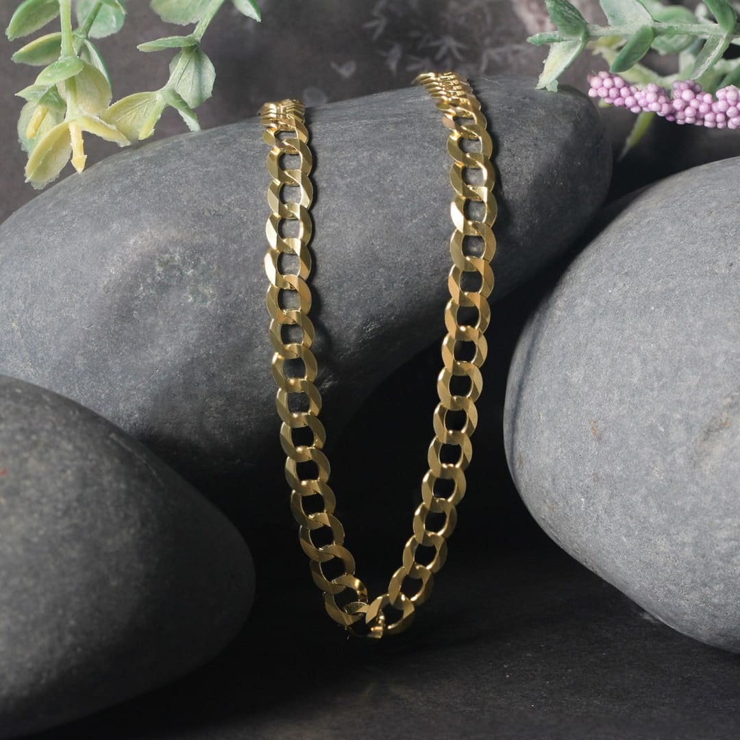 This solid curb chain comes in 14k yellow gold and has a width of 5.7 millimeters.