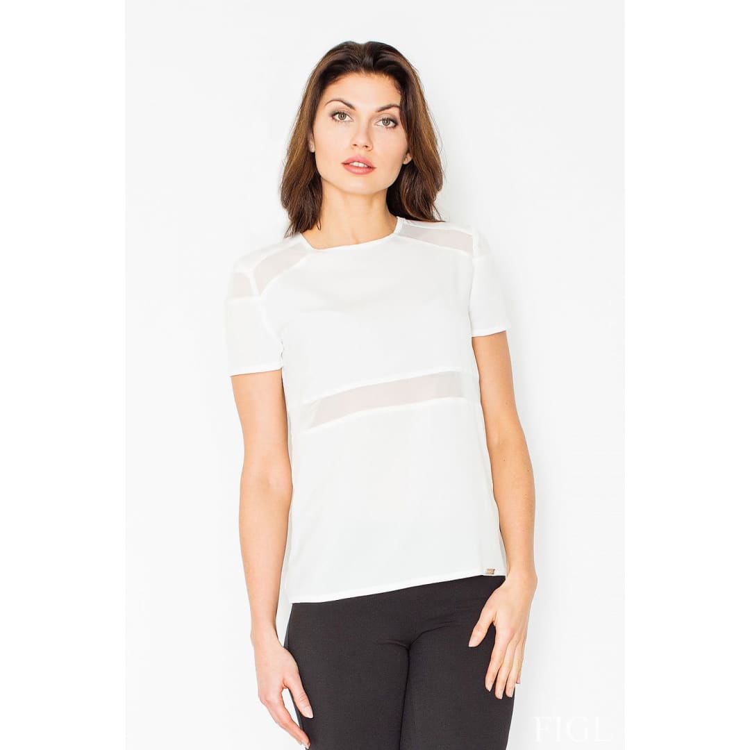 Simple blouse with short sleeves fastened with a covered zip. Blouse decorated with mesh inserts.