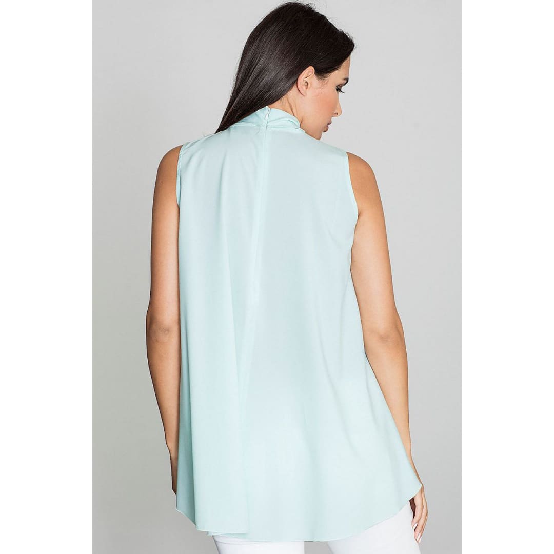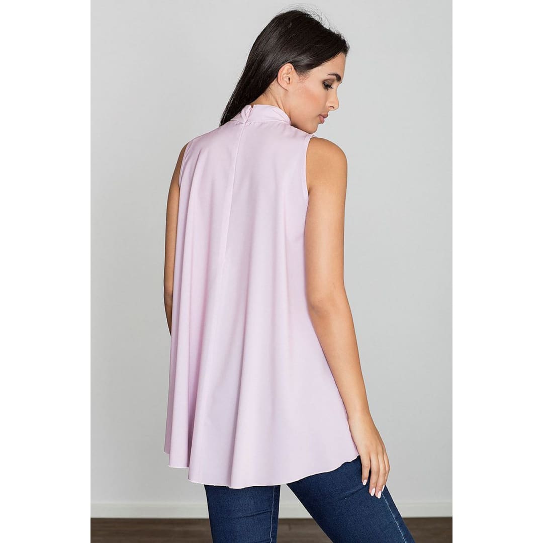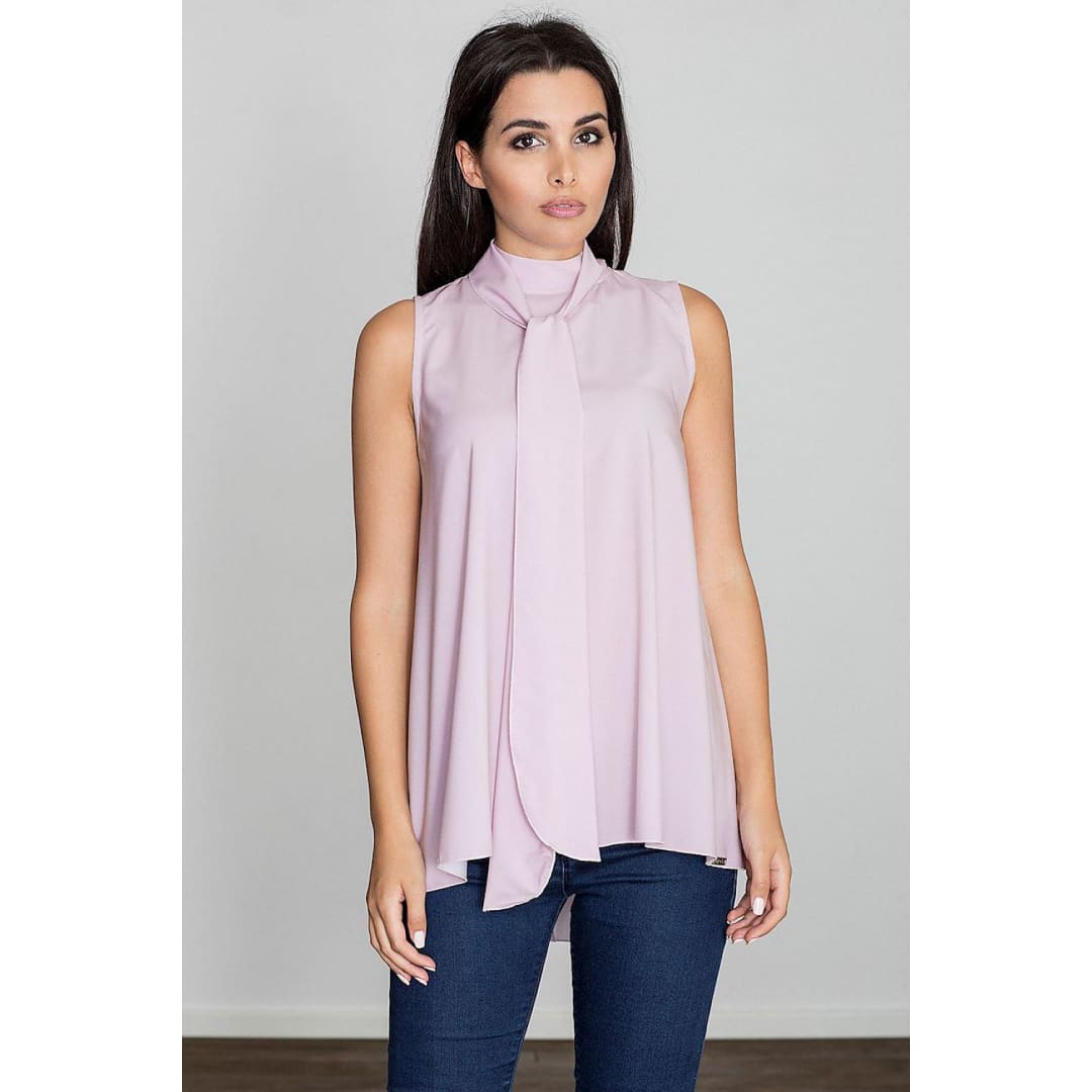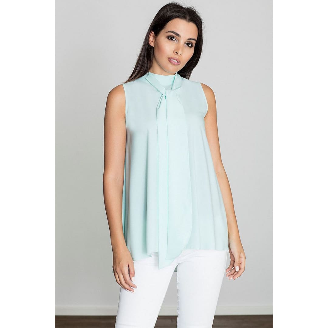 Smooth, flared blouse, the model uncovers the shoulders. Decorative ties at the front, a covered zipper at the back.