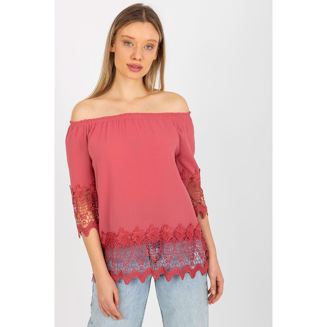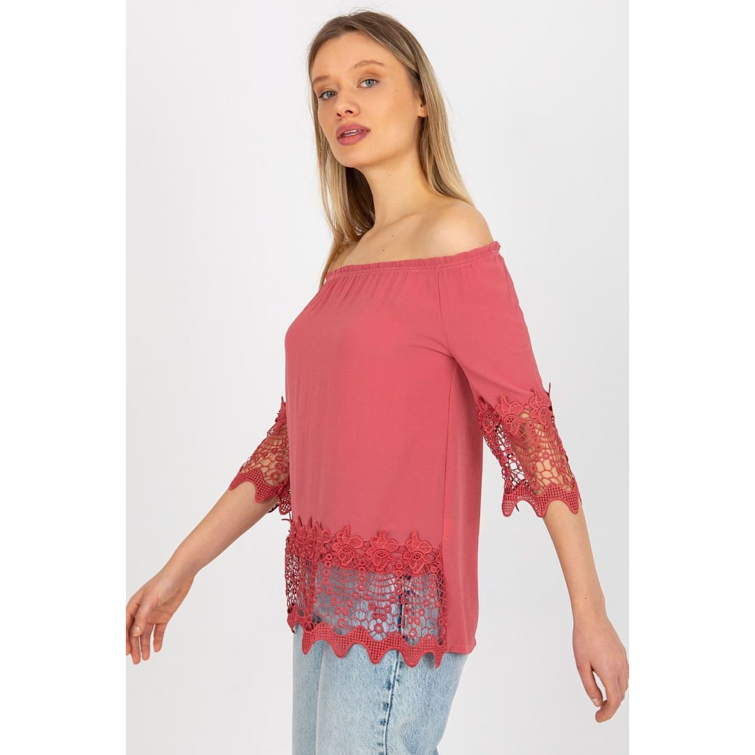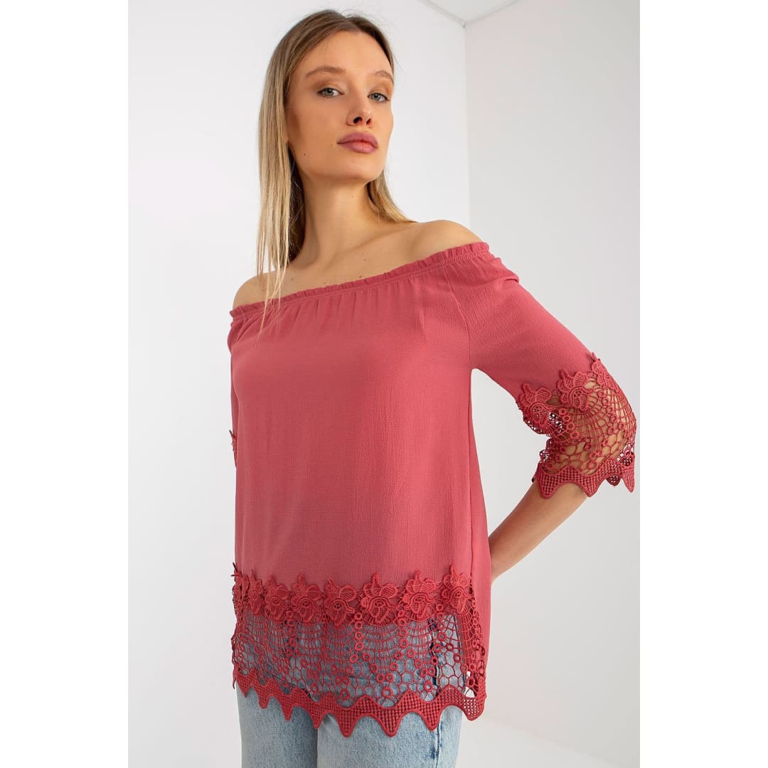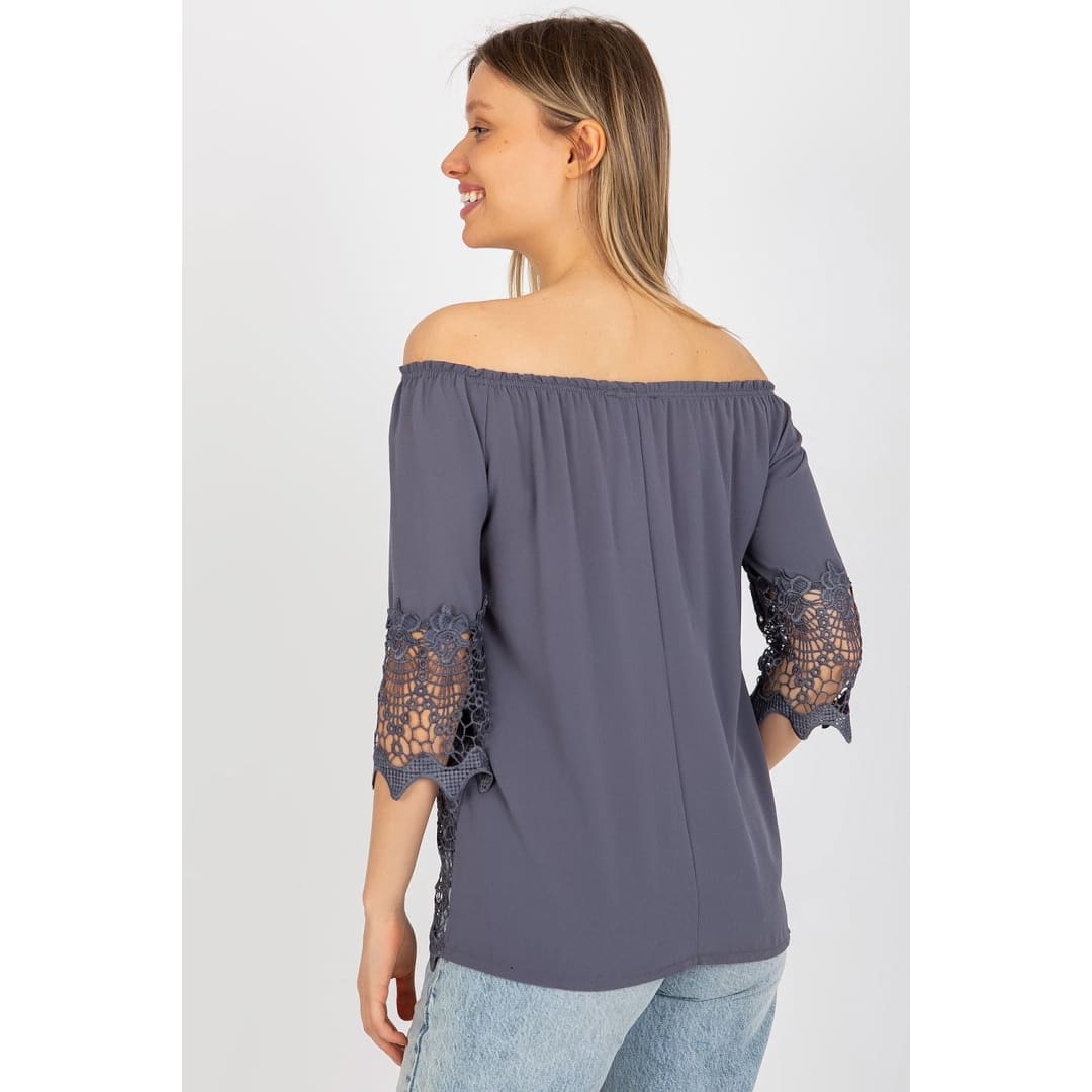 Blouse with 3/4 sleeves and a Spanish-style neckline. Sleeves and bottom of blouse with interesting trim.