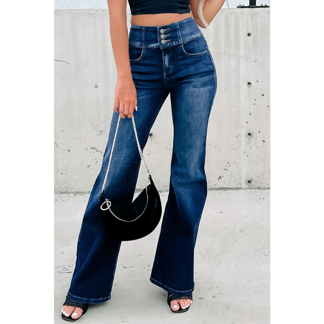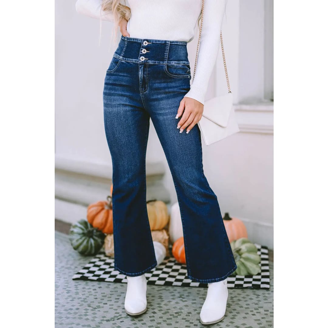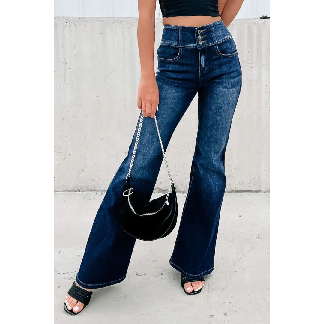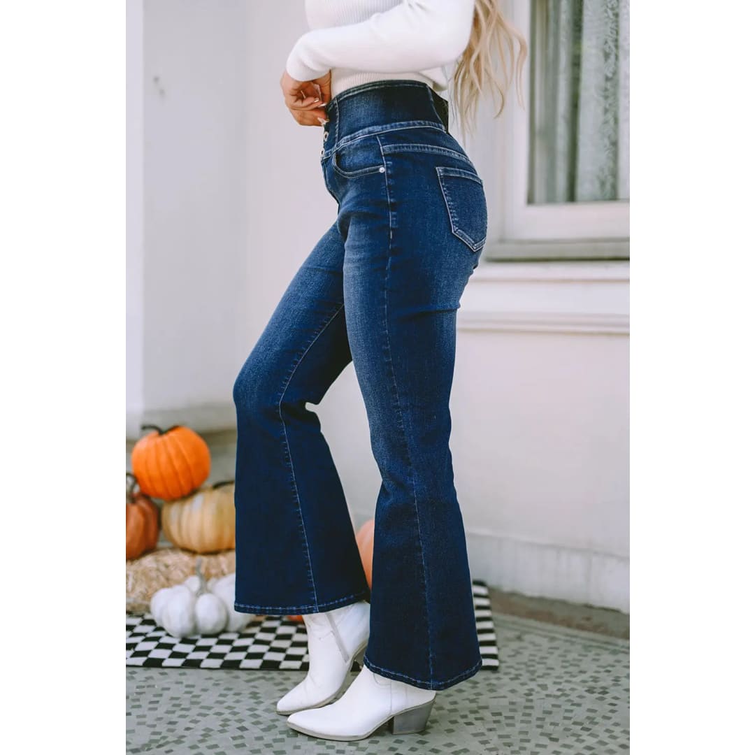 Blue Buttons Elastic Wide Waistband Back Flare Jeans