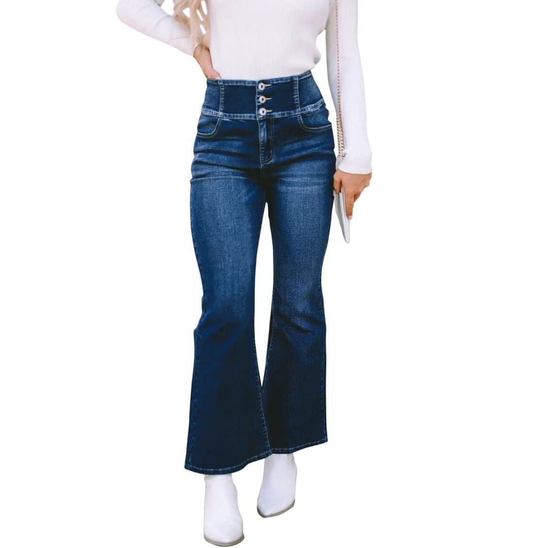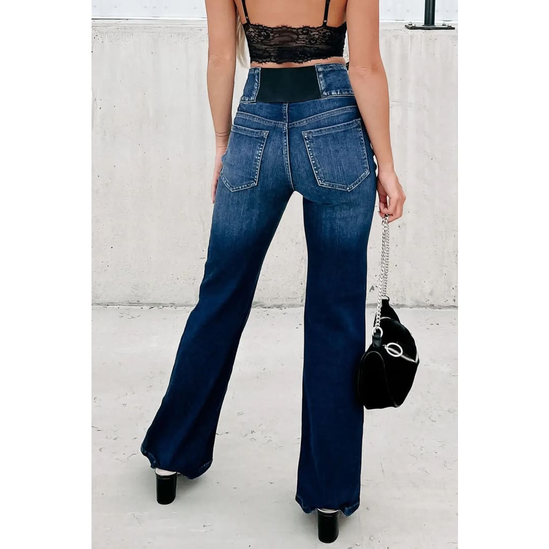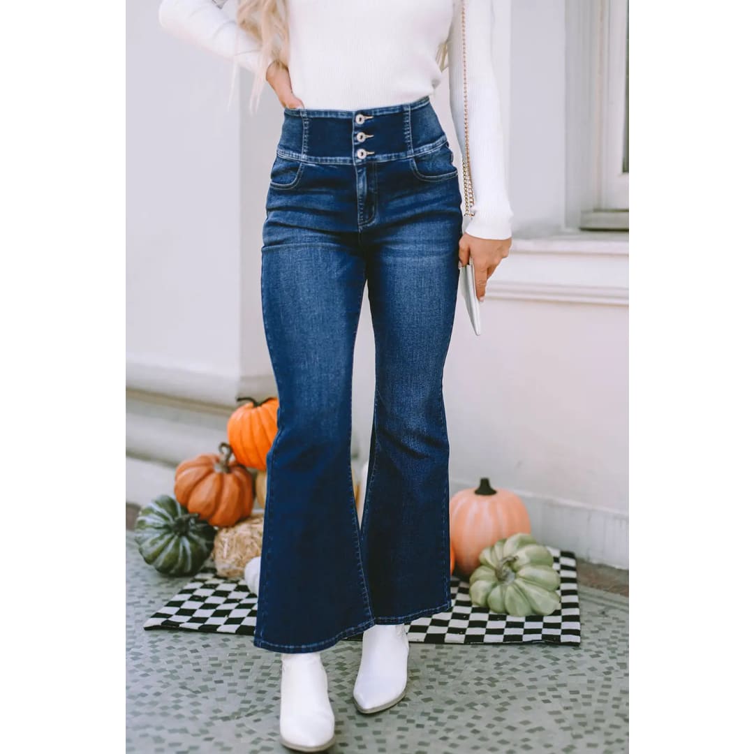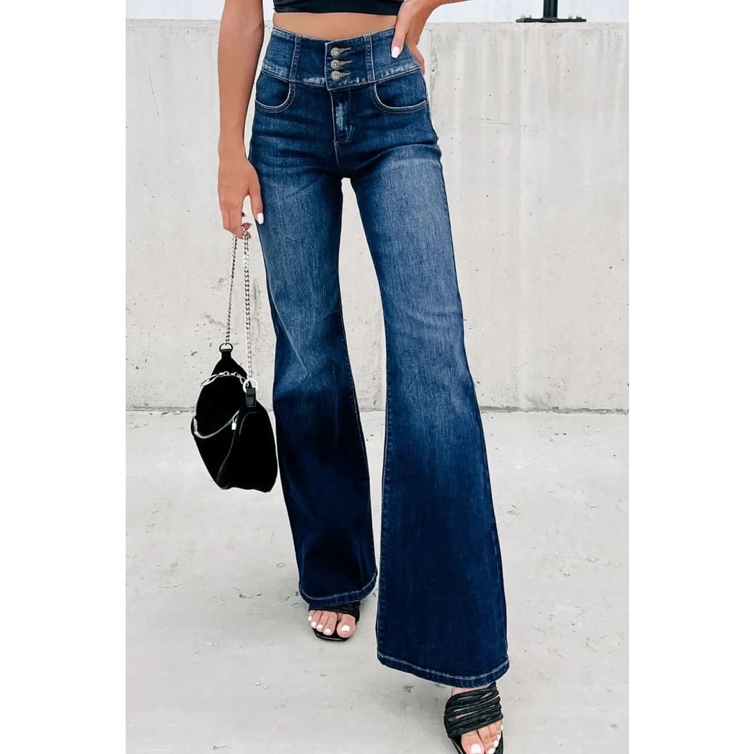 Blue Buttons Elastic Wide Waistband Back Flare Jeans