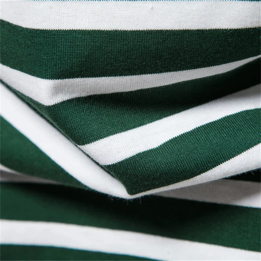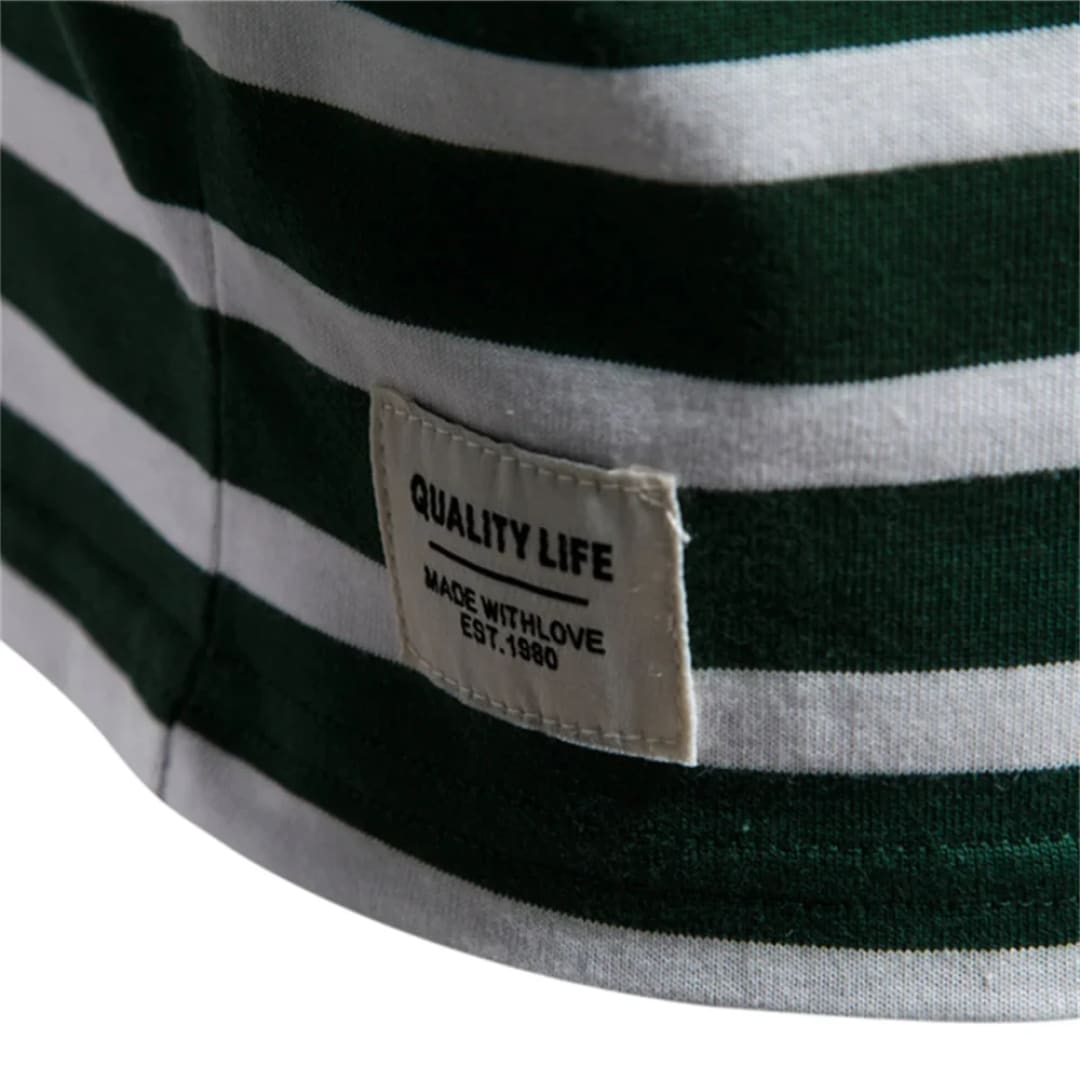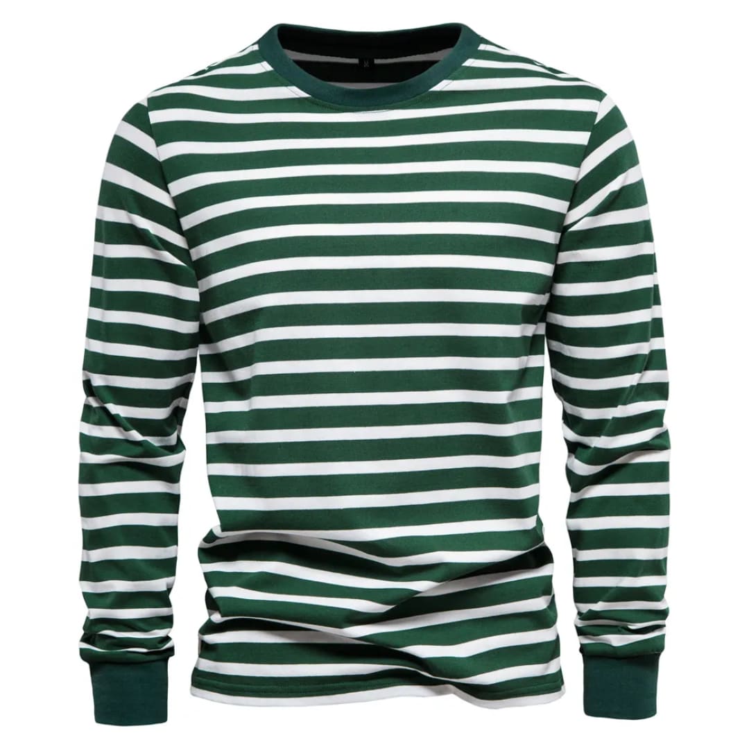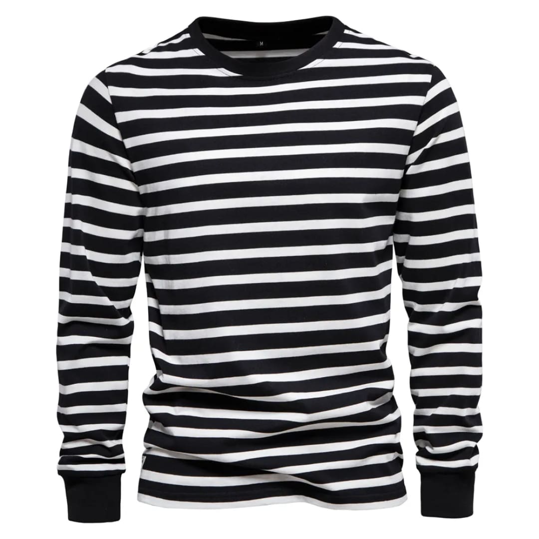 Inject a dash of timeless style into your everyday look with this classic striped long sleeve tee. This piece is a versatile staple that brings a fresh and preppy vibe to your casual attire. The shirt’s crisp stripes against a clean white background make for a striking look that can be effortlessly paired with jeans or chinos. Crafted from soft, breathable cotton, this tee ensures comfort throughout the day, whether you’re on the go or relaxing at home. The ribbed cuffs add a subtle detail and help maintain the shirt's shape, making it a durable addition to your wardrobe.