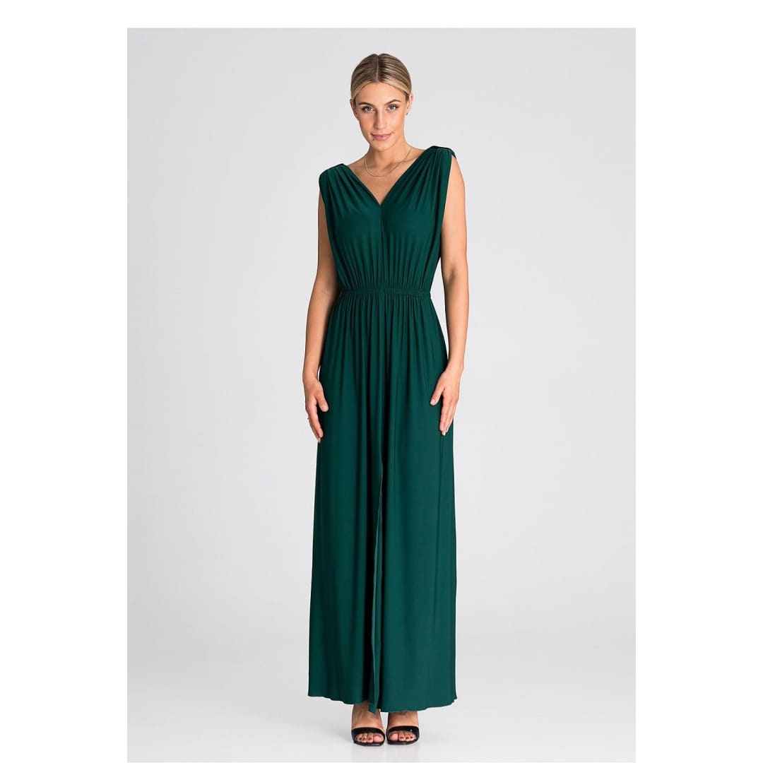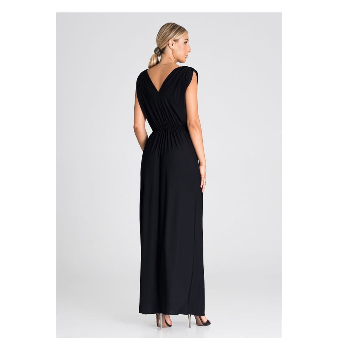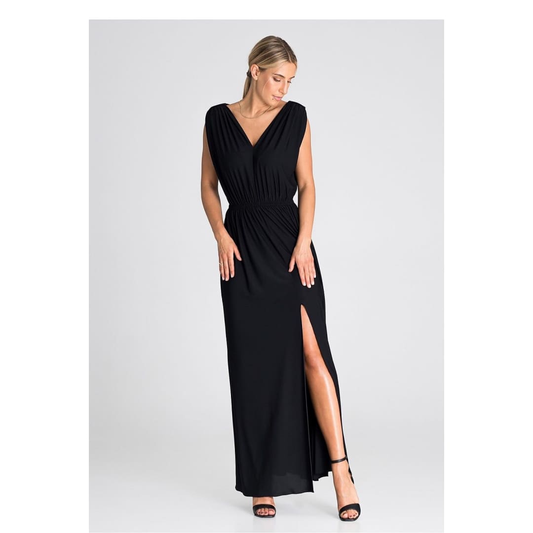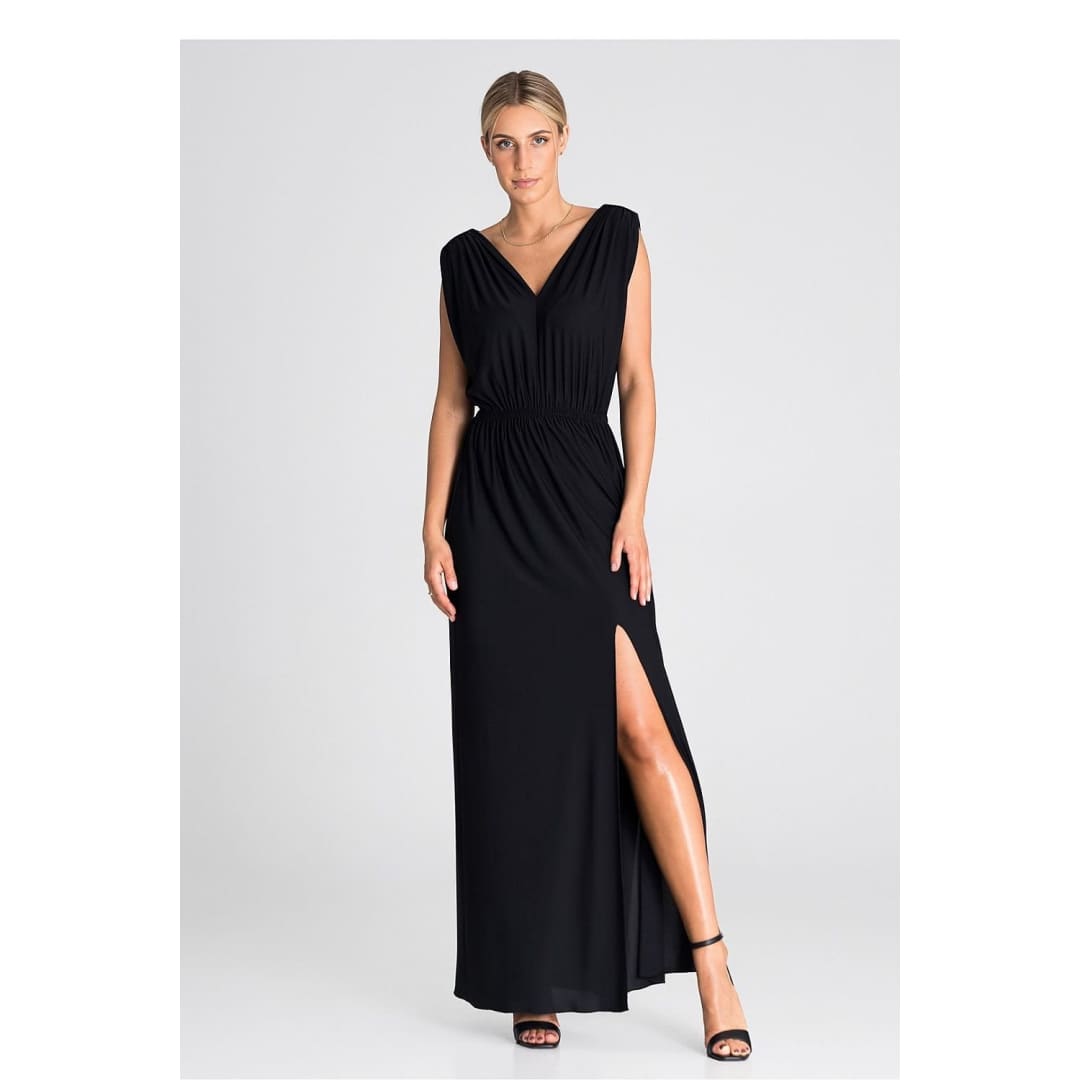 Introducing an elegant maxi dress that is an excellent choice for various occasions. The dress has wide, thick shoulder straps that give it stability. Pagons on the shoulders add character and style. There is an elastic waistband that accentuates the waist and provides comfort. The front of the dress has an eye-catching ruffle, which gives it lightness and freedom of movement. In addition, it features a slit that adds a touch of sex appeal. This is a dress that will allow you to feel both special and comfortable at any party or special occasion.