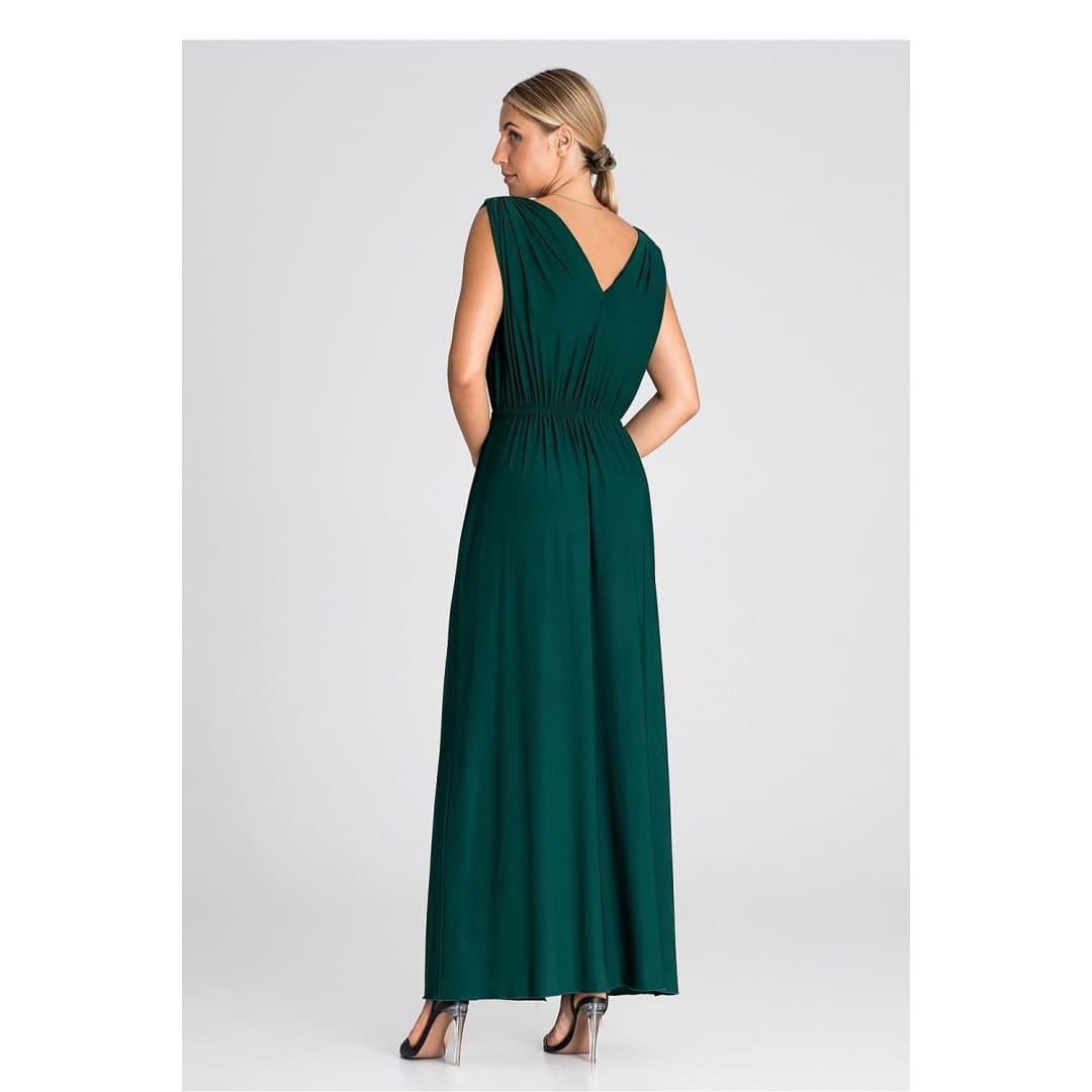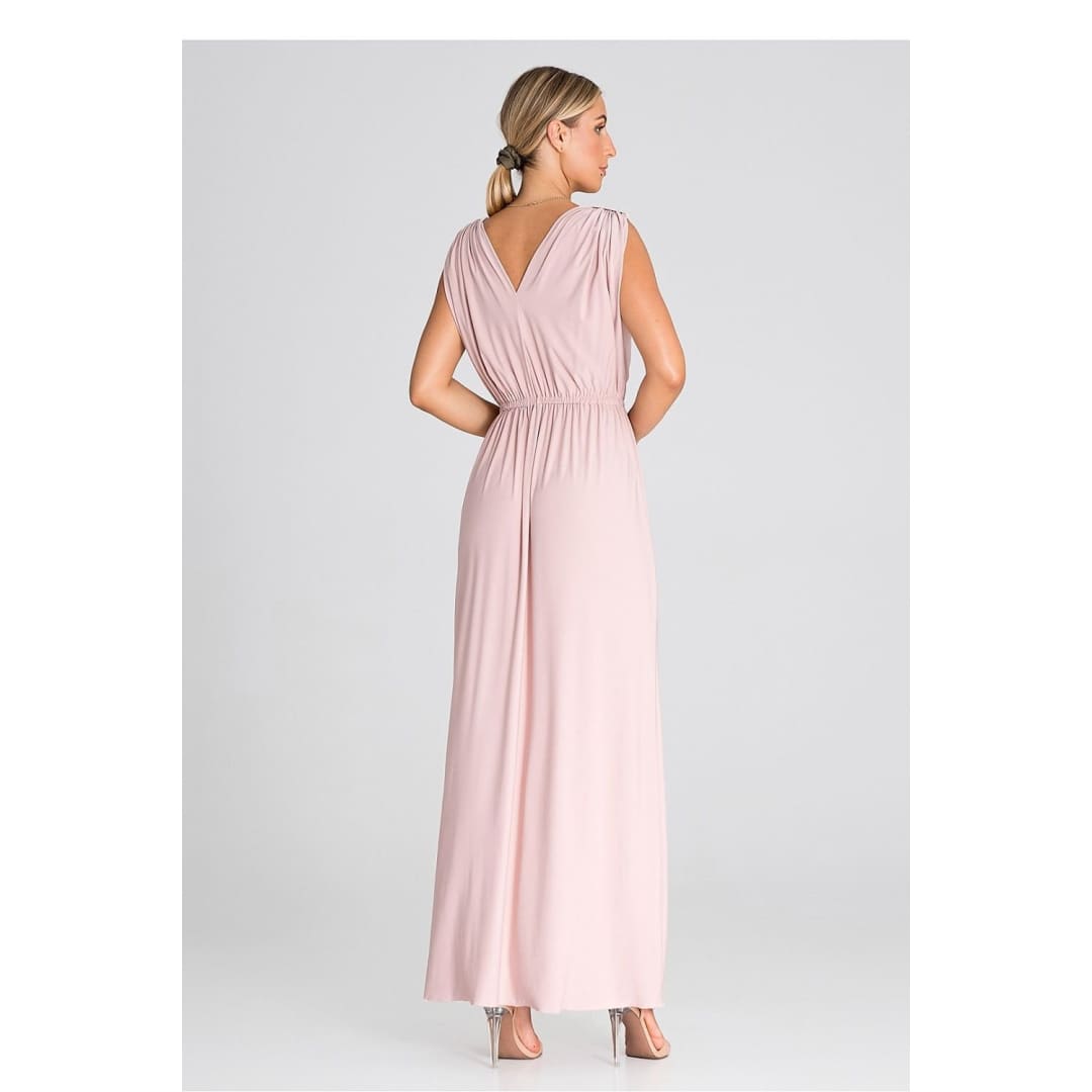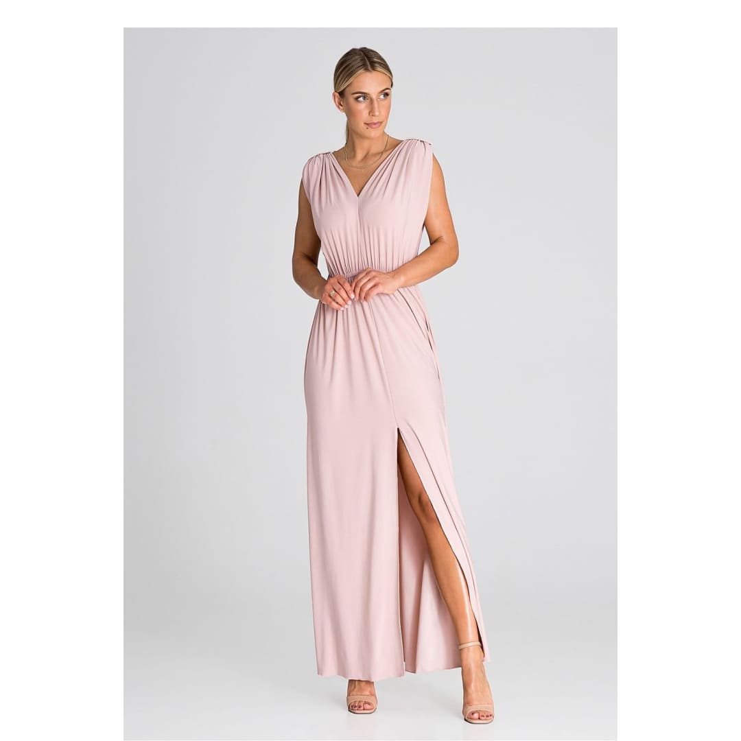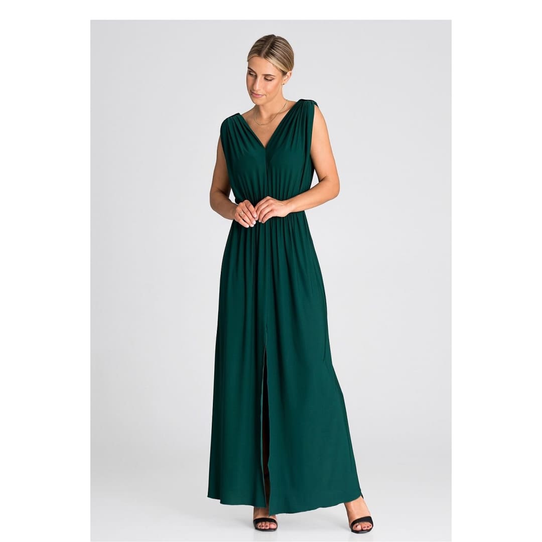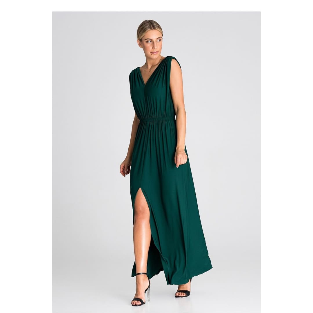 Introducing an elegant maxi dress that is an excellent choice for various occasions. The dress has wide, thick shoulder straps that give it stability. Pagons on the shoulders add character and style. There is an elastic waistband that accentuates the waist and provides comfort. The front of the dress has an eye-catching ruffle, which gives it lightness and freedom of movement. In addition, it features a slit that adds a touch of sex appeal. This is a dress that will allow you to feel both special and comfortable at any party or special occasion.