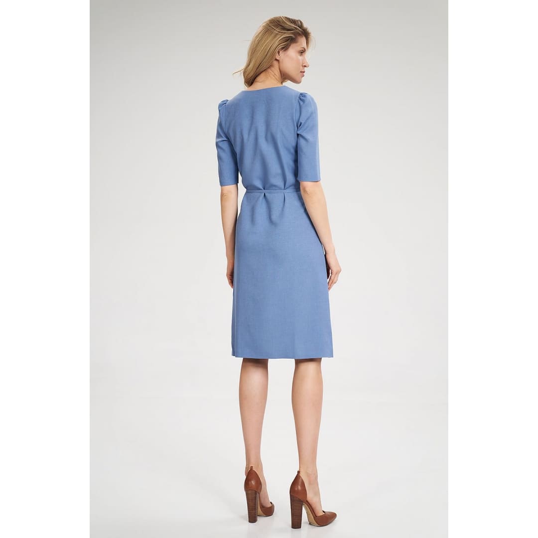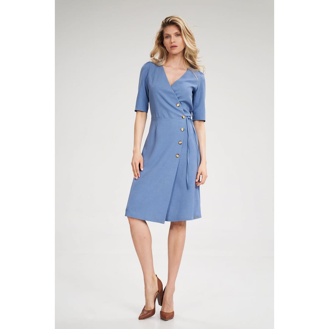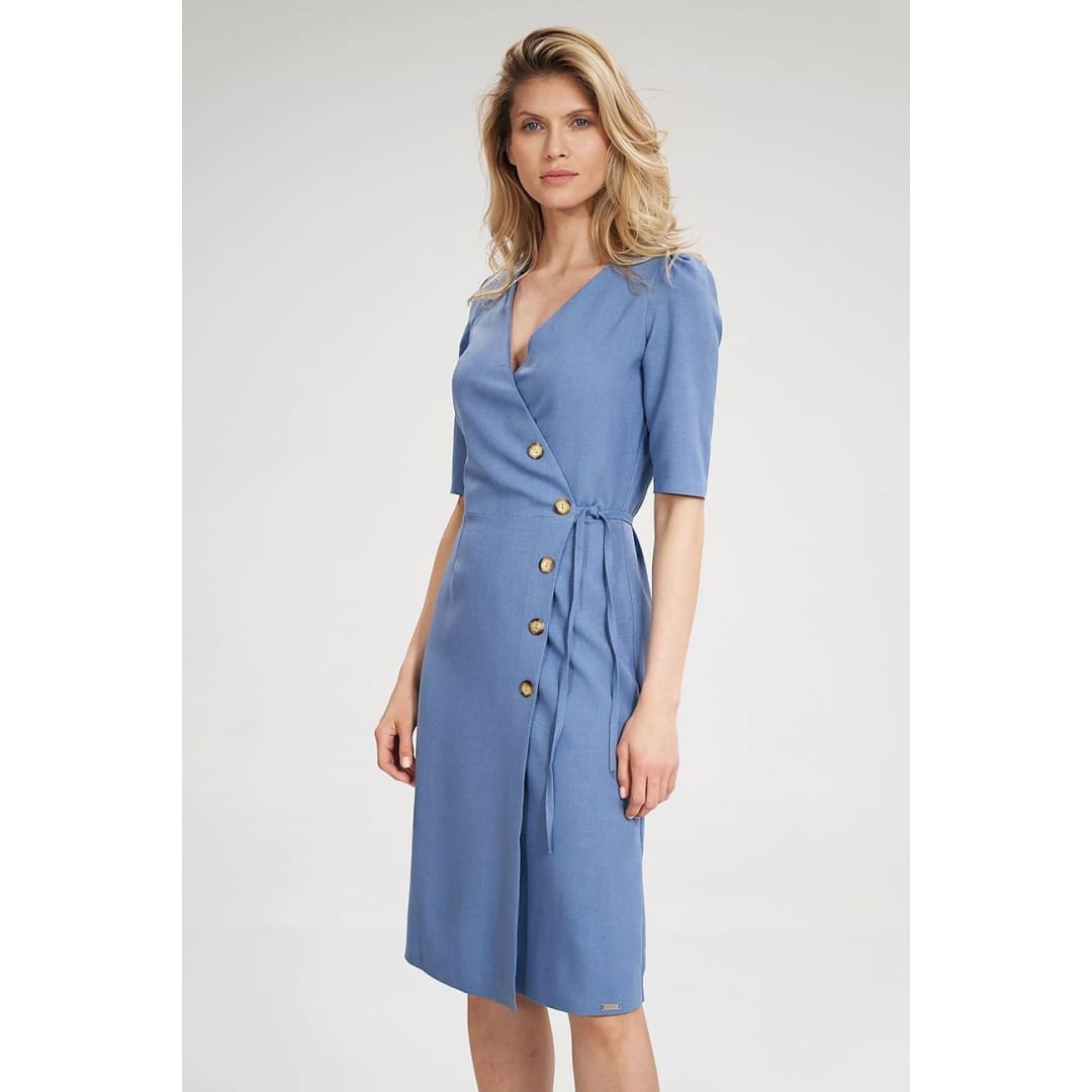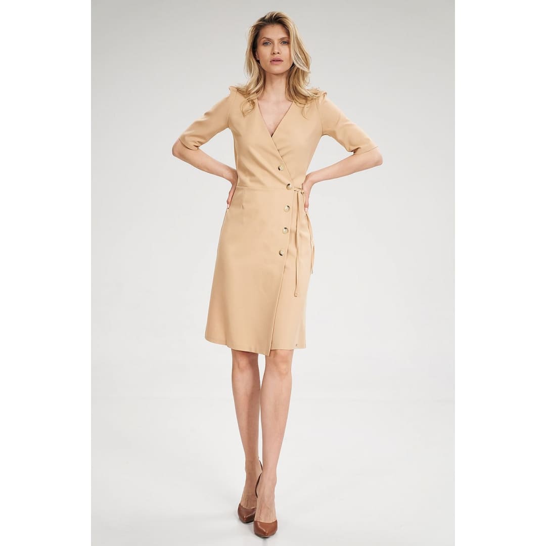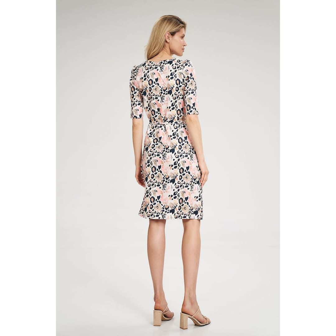 A midi envelope dress in leopard print. Cheese neckline, short ruffled sleeves, tied at the waist, decorative buttons at the front.