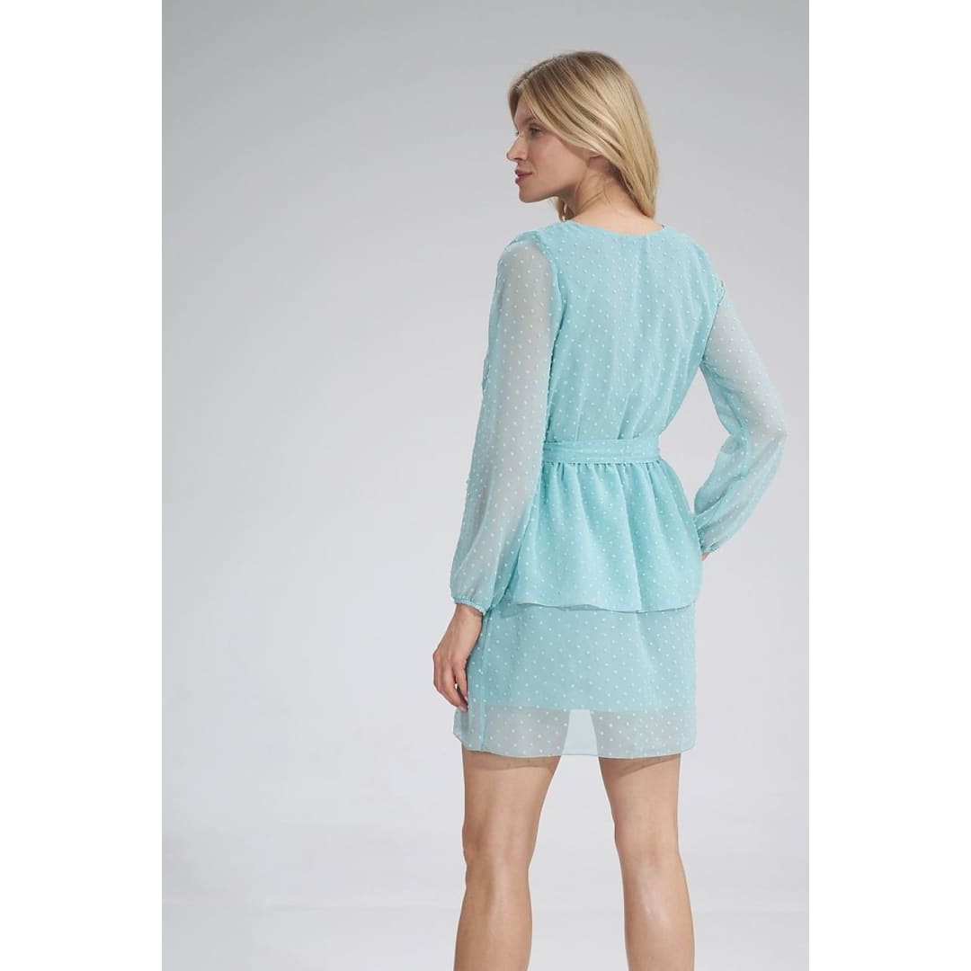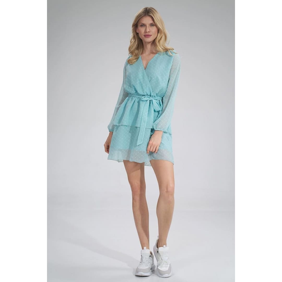Airy chiffon dress with long sleeves finished with an elastic band, envelope neckline. At the waist sewn with an elastic band and tied with a belt. The bottom of the dress with two frills, lined, without a fastener.