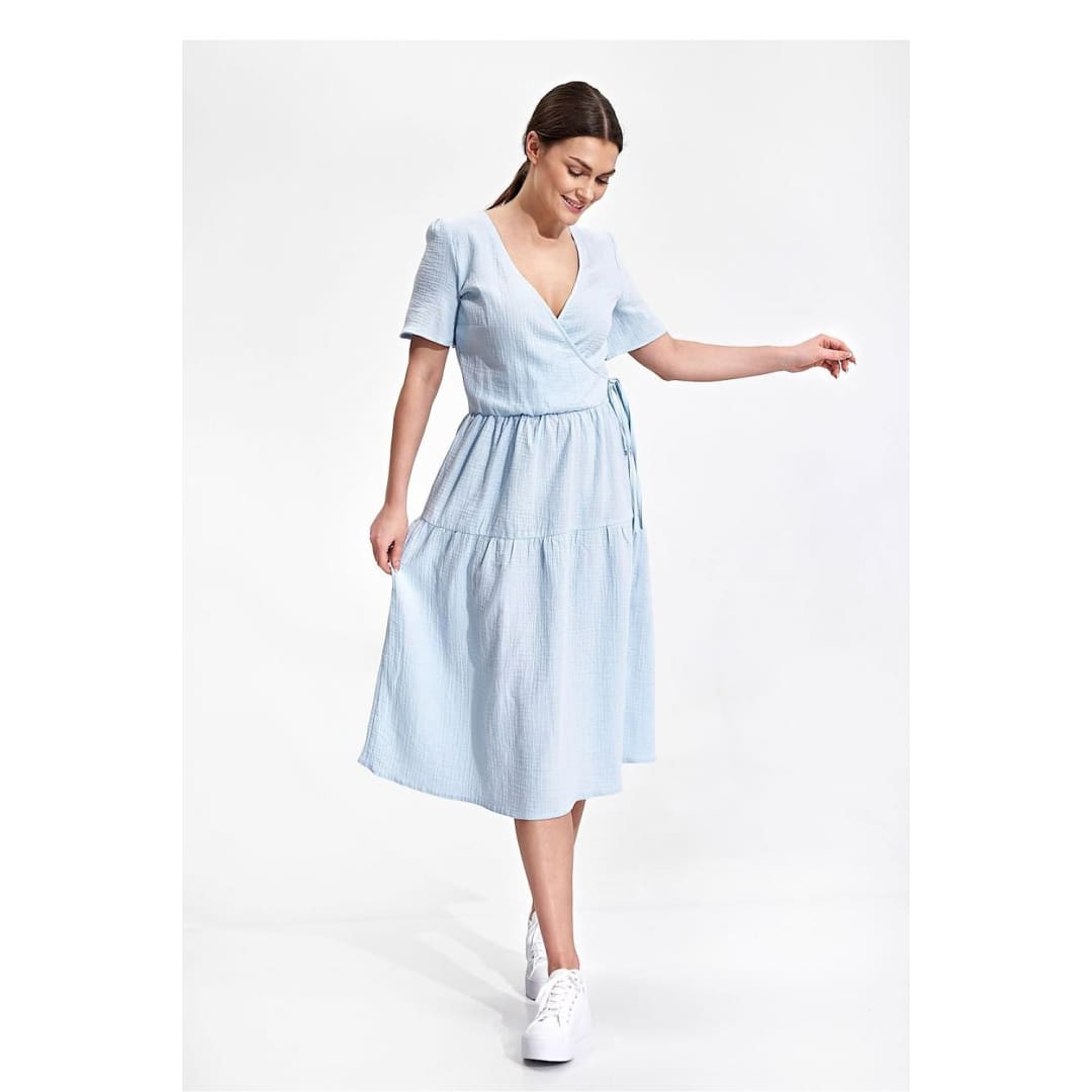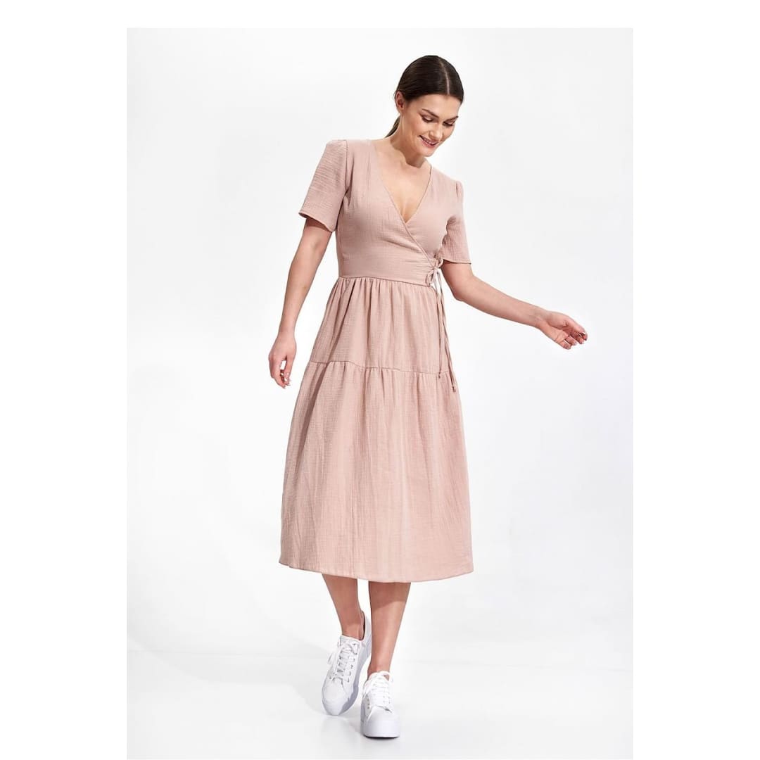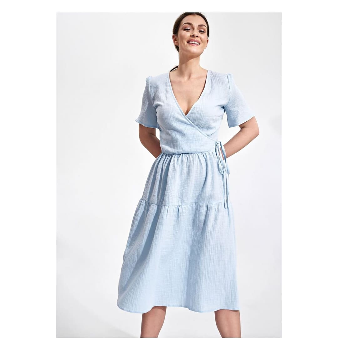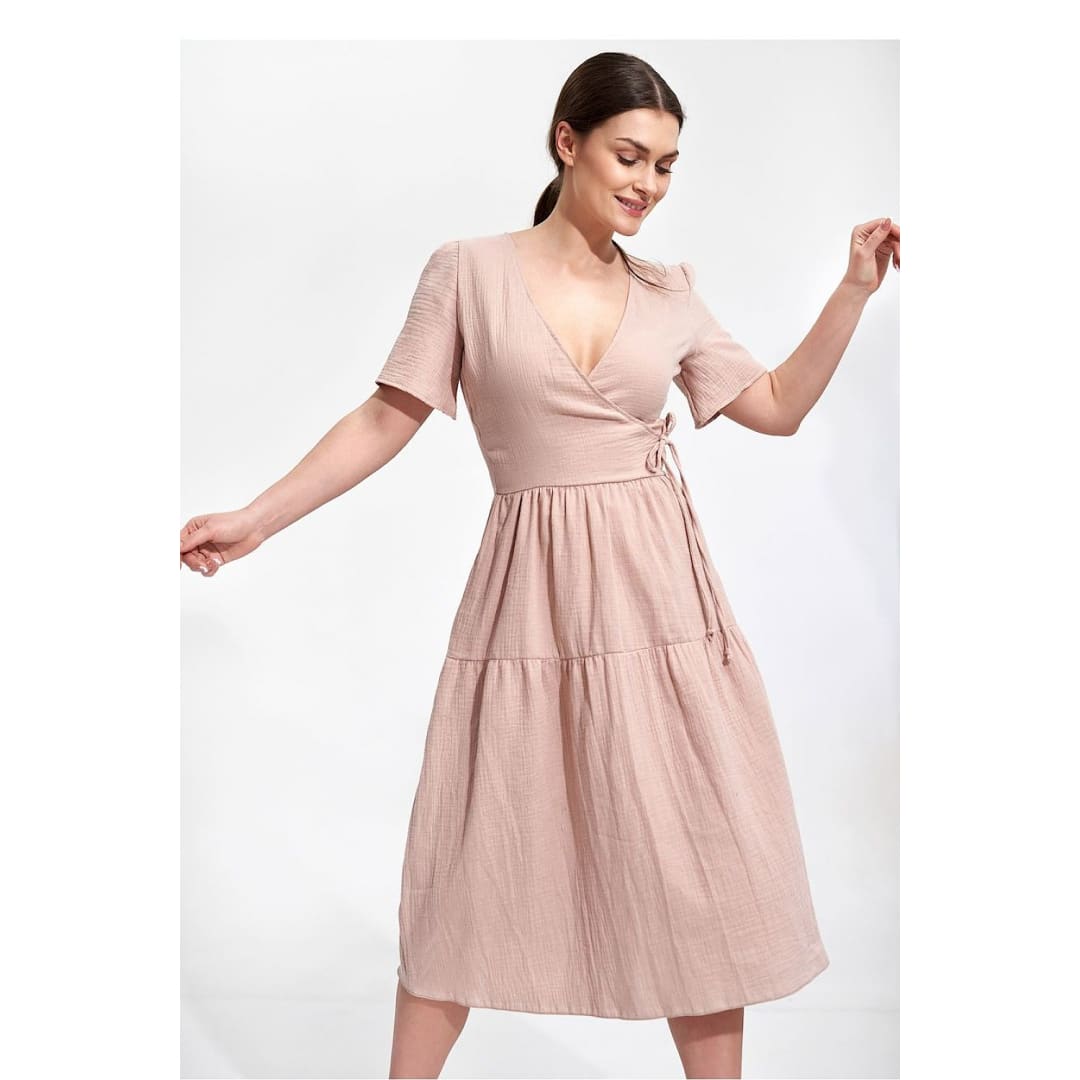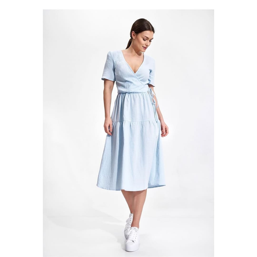 Summer midi dress with short sleeves, envelope neckline with decorative binding on the side. Dress has a flared cut, a covered zipper, and no pockets.