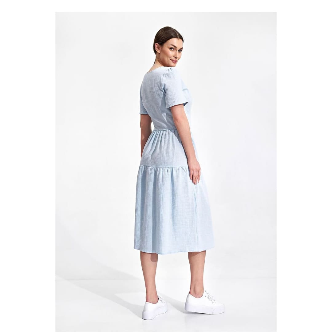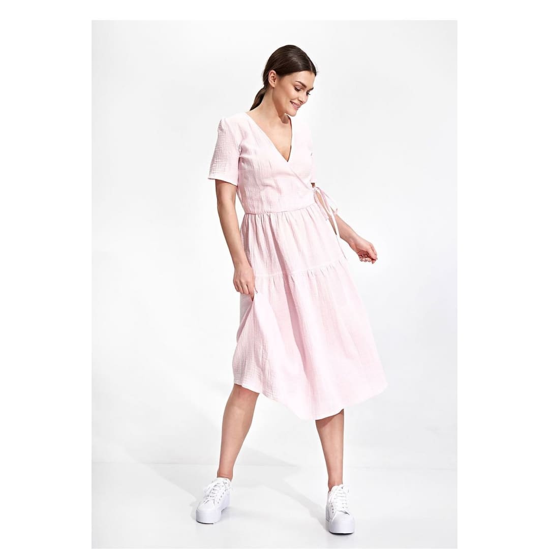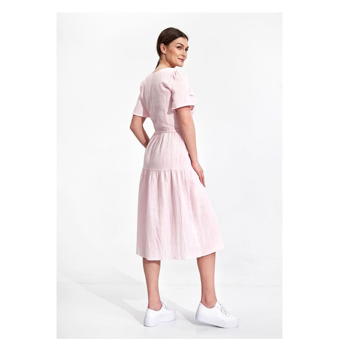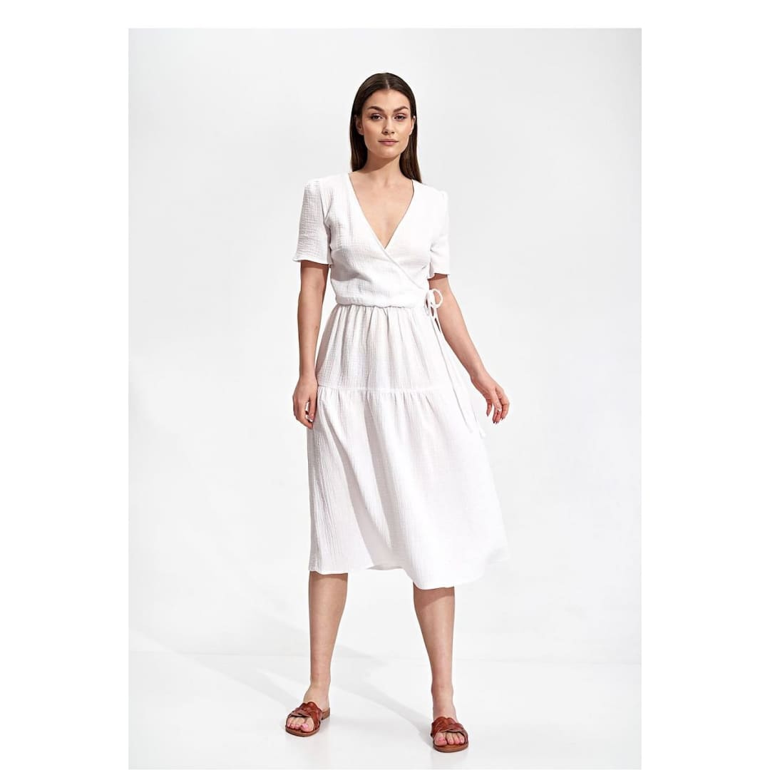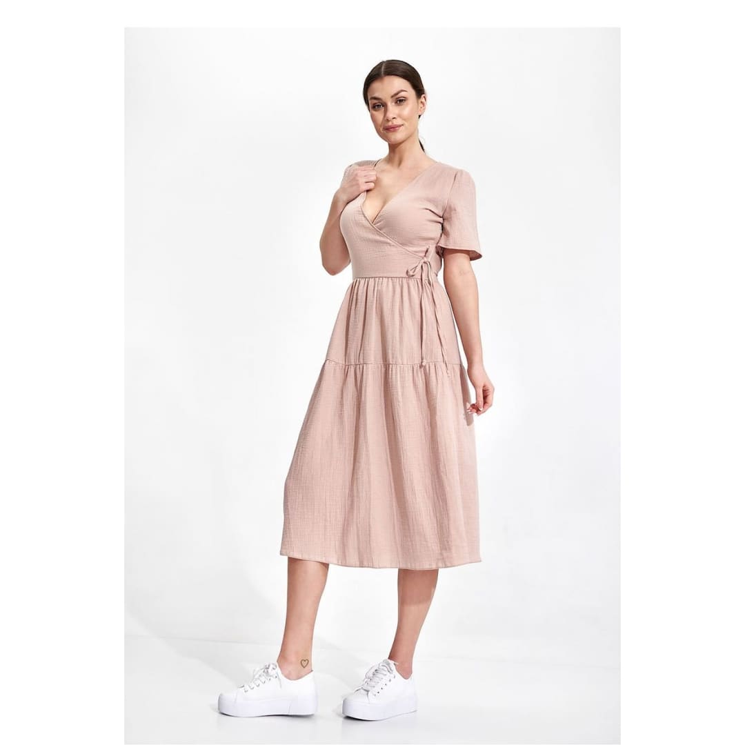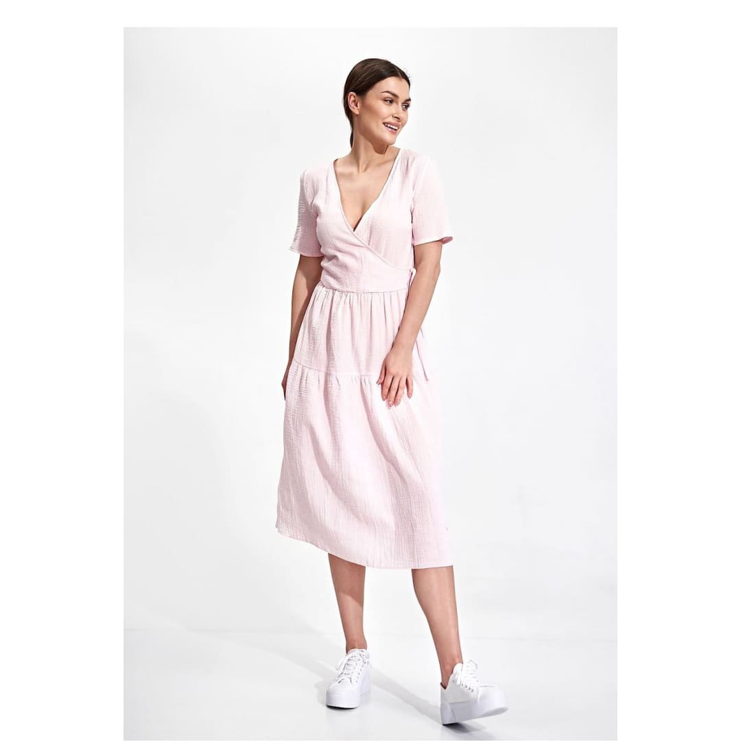 Summer midi dress with short sleeves, envelope neckline with decorative binding on the side. Dress has a flared cut, a covered zipper, and no pockets.
