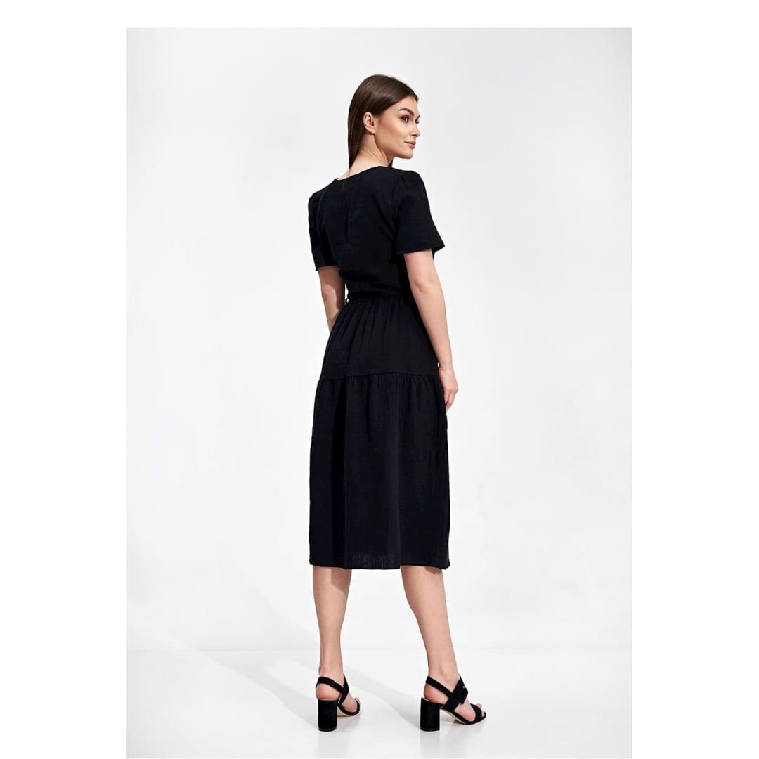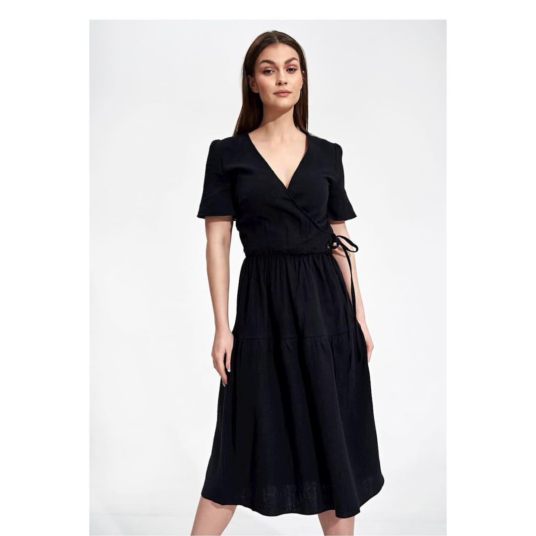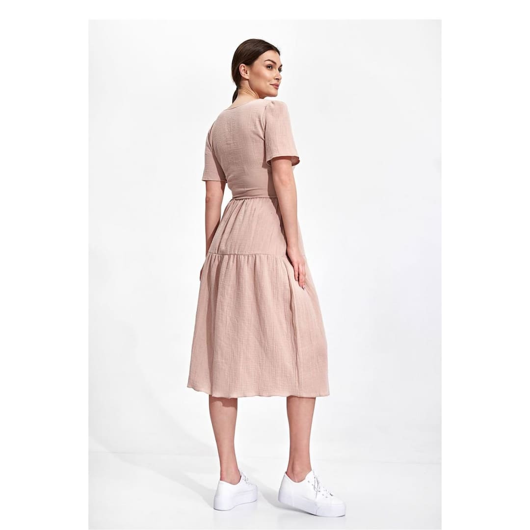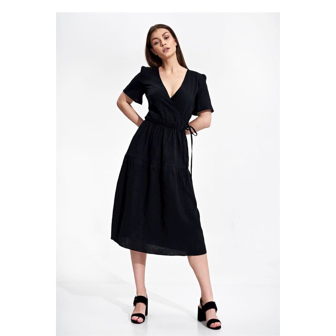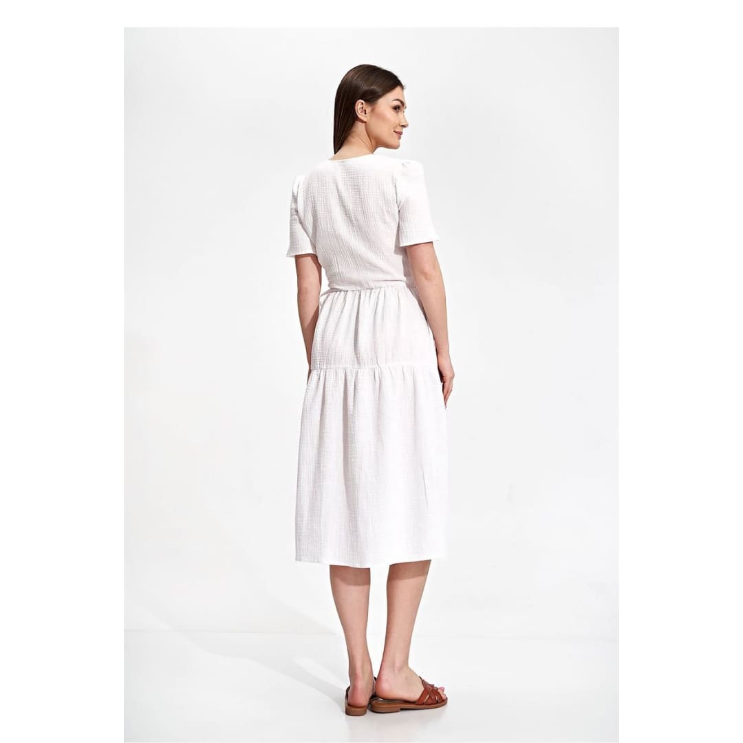Summer midi dress with short sleeves, envelope neckline with decorative binding on the side. Dress has a flared cut, a covered zipper, and no pockets.