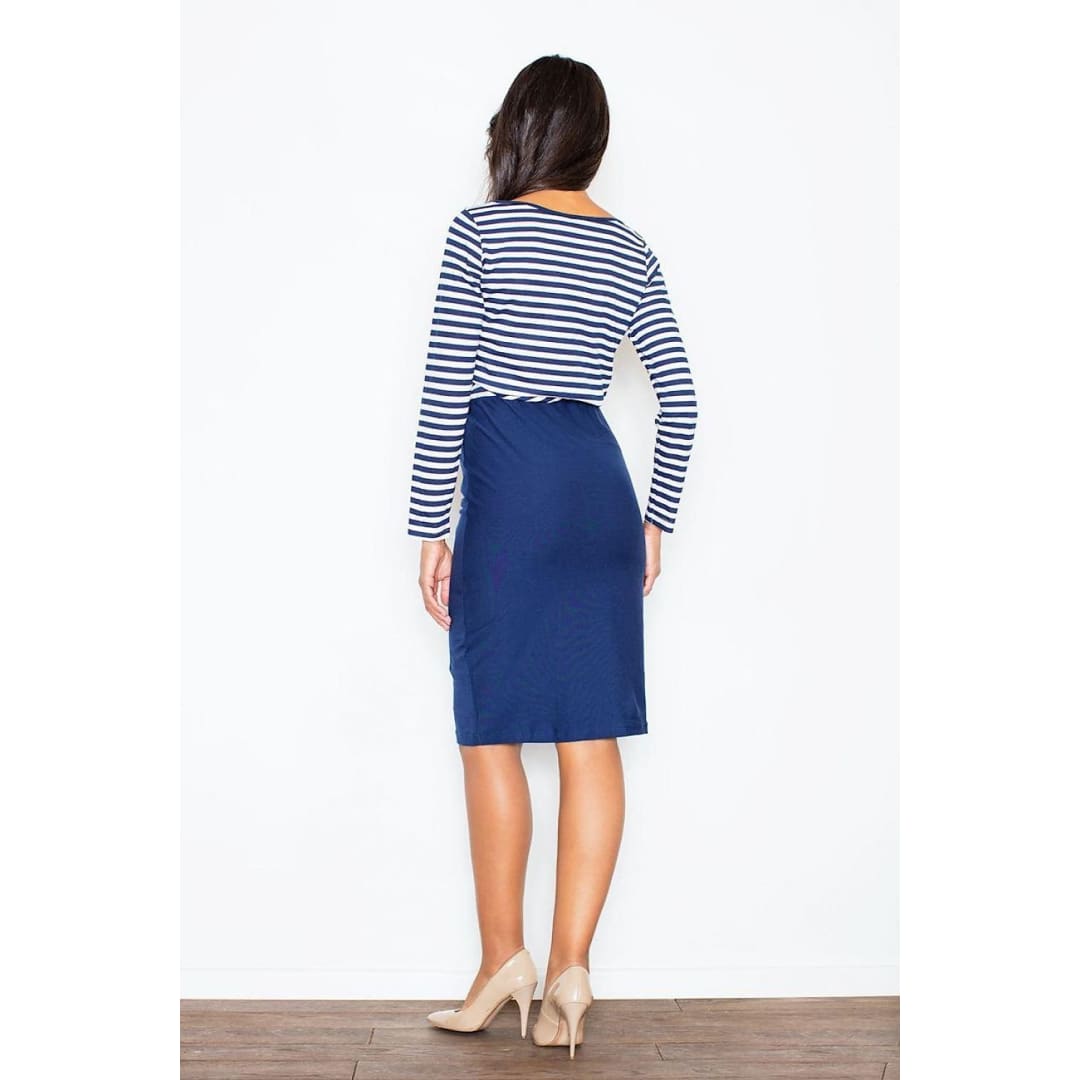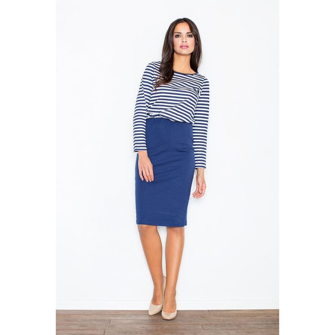 Classic elegance! Midi length dress made of airy and nice in touch cotton. Striped top with a looser cut. Elastic at waist. The bottom is a tight skirt, beautifully emphasizing feminine shapes. Dress available in three color versions. Ideal for everyday at work, as well as for evening outings.