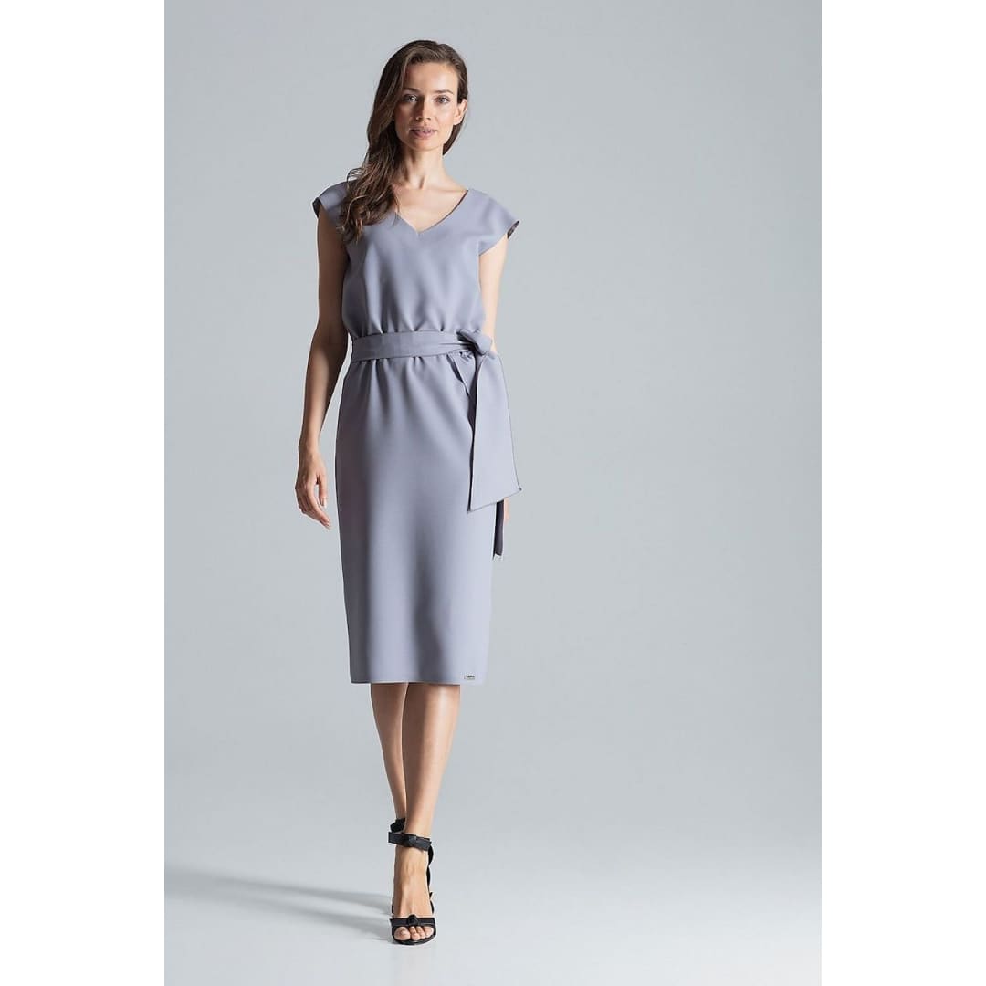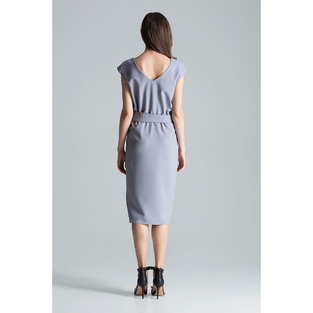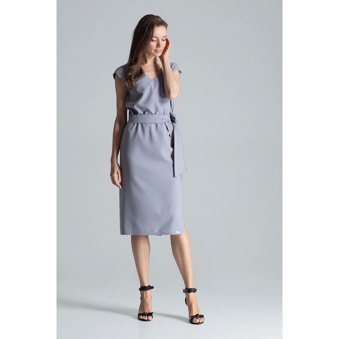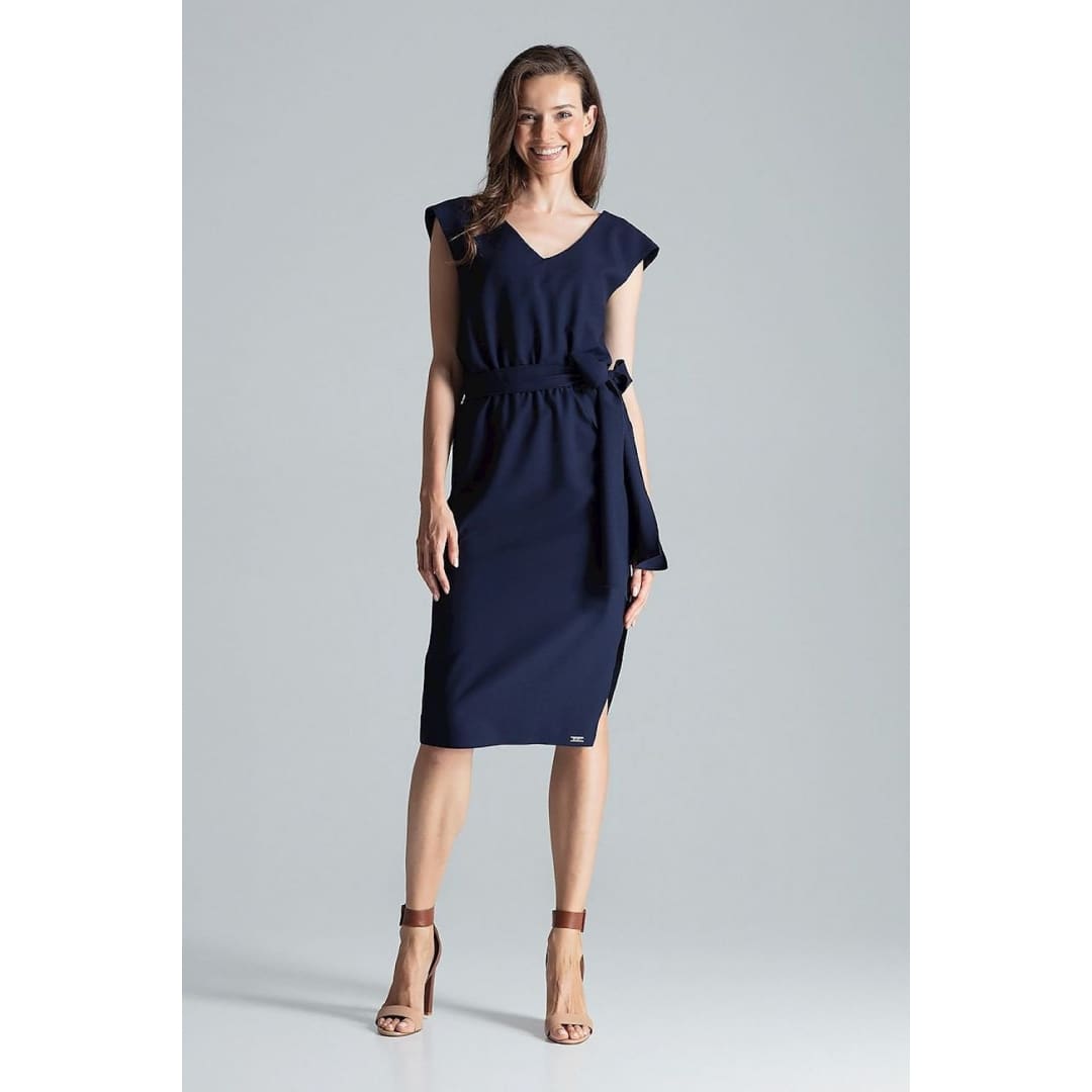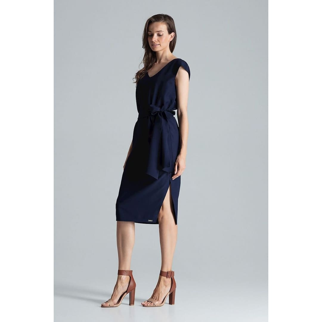 Navy blue midi dress with a v-neck, an elastic band at the waist. Additional fabric, tied belt. An asymmetrical slit on the left leg, unlined.