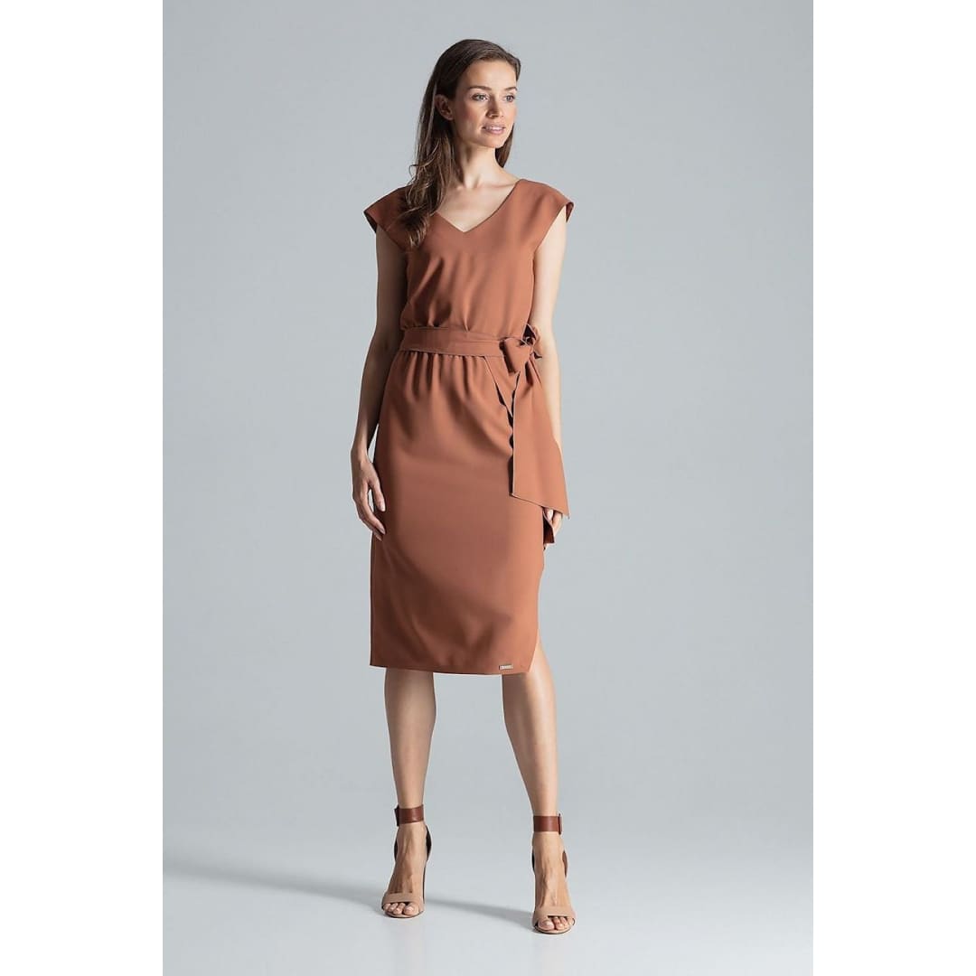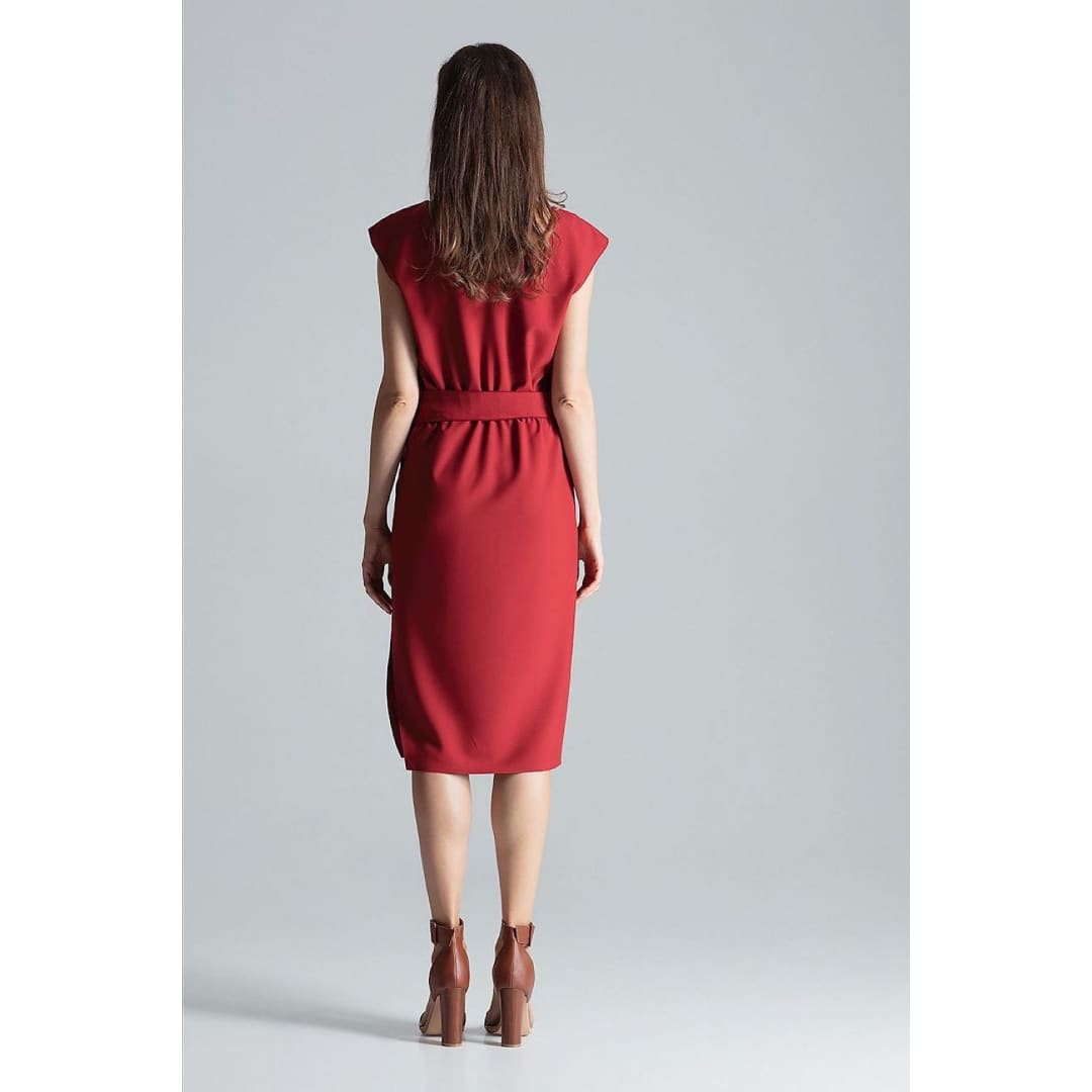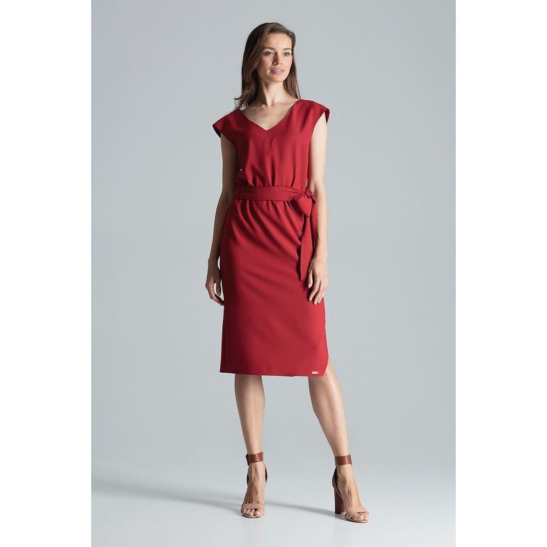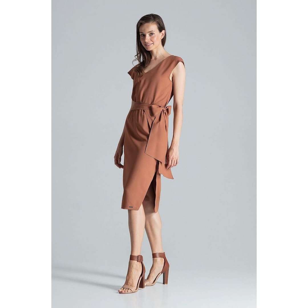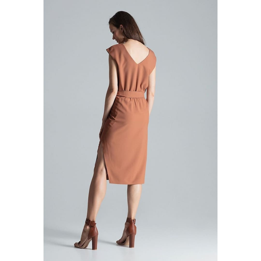 Navy blue midi dress with a v-neck, an elastic band at the waist. Additional fabric, tied belt. An asymmetrical slit on the left leg, unlined.