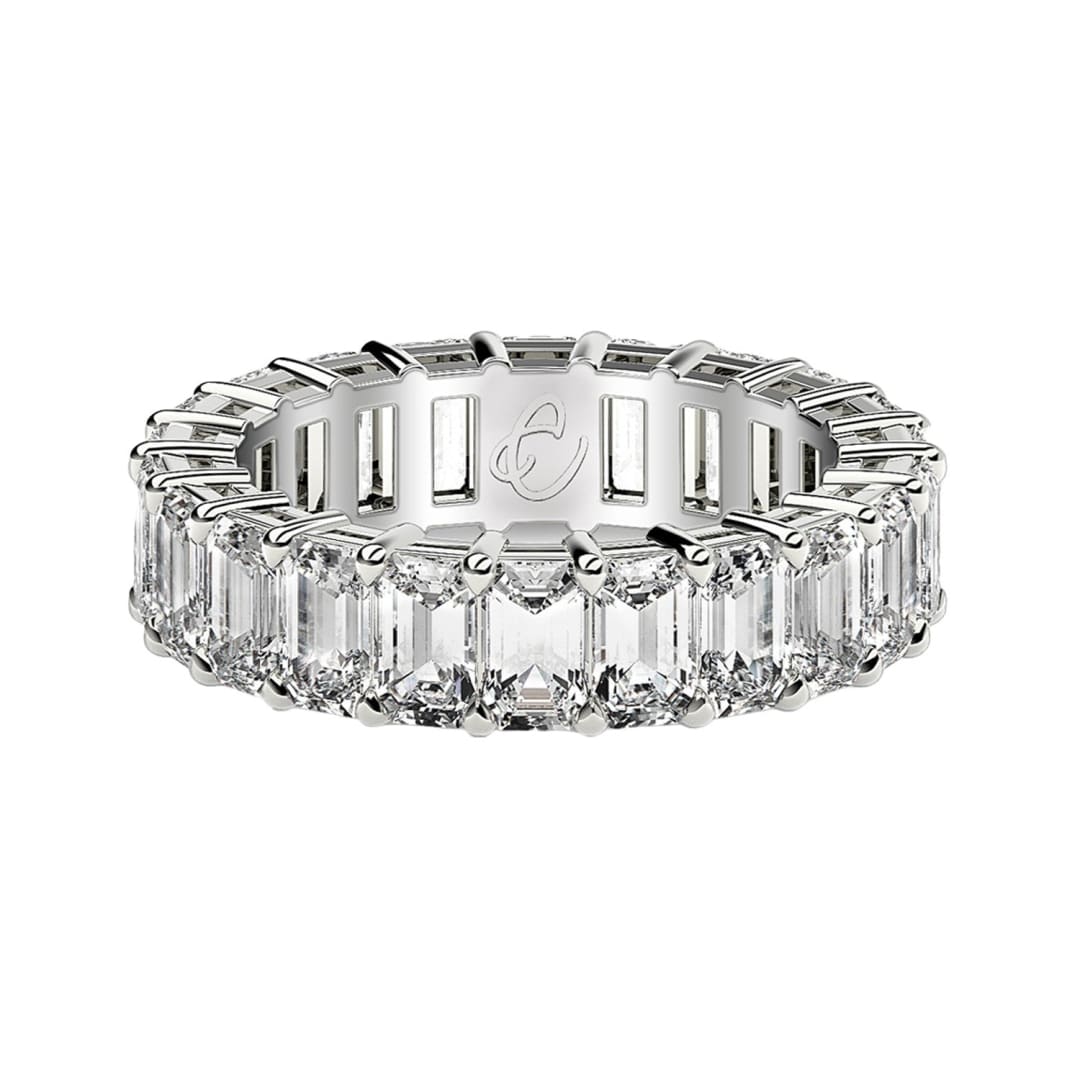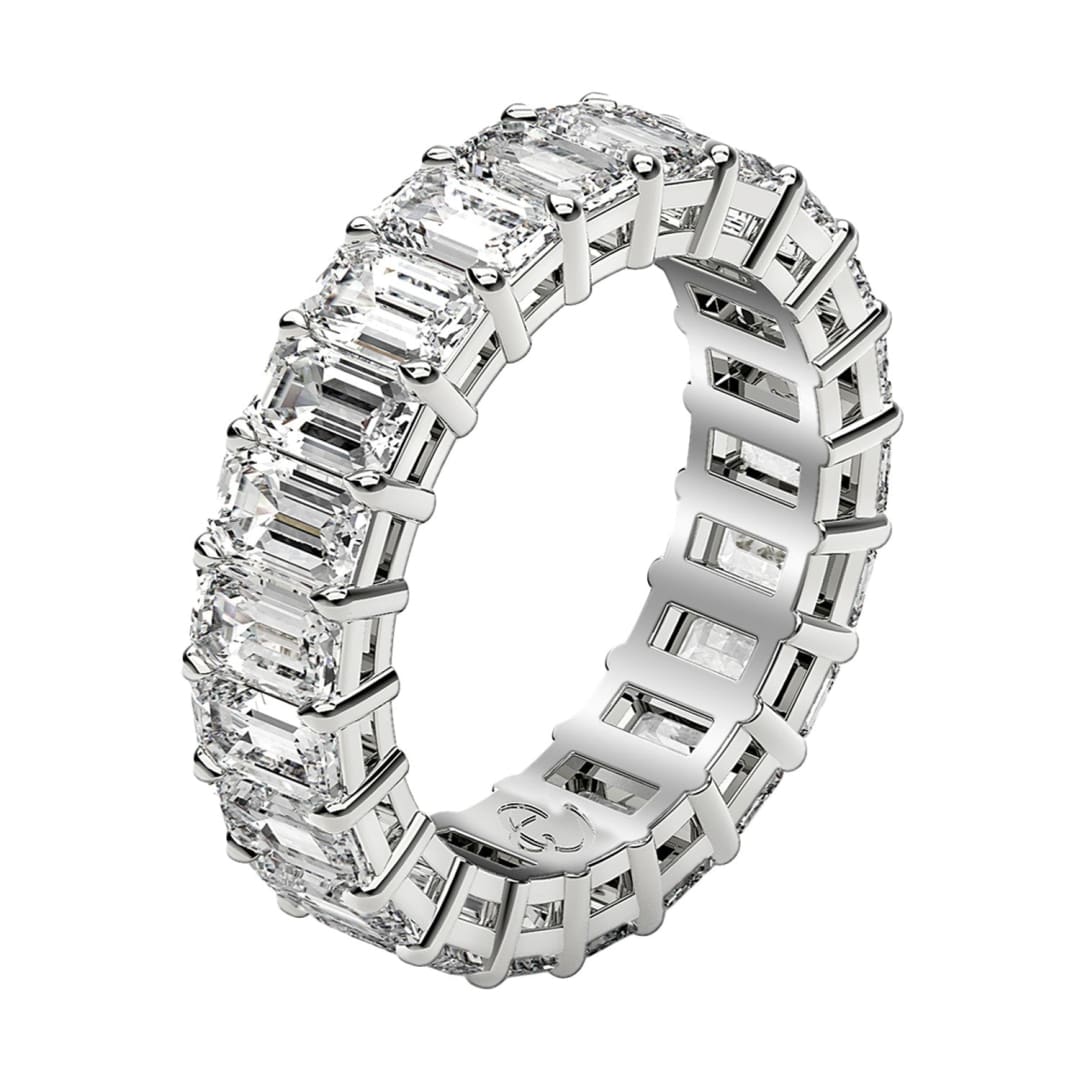 This dramatic eternity band features the traditional shine of 14k white gold, and the unparalleled sophistication of beautiful prong-set emerald cut lab grown diamonds. The light it radiates is as eternal and bright as the emotion it symbolizes. This ring belongs to the Eternity Us collection.