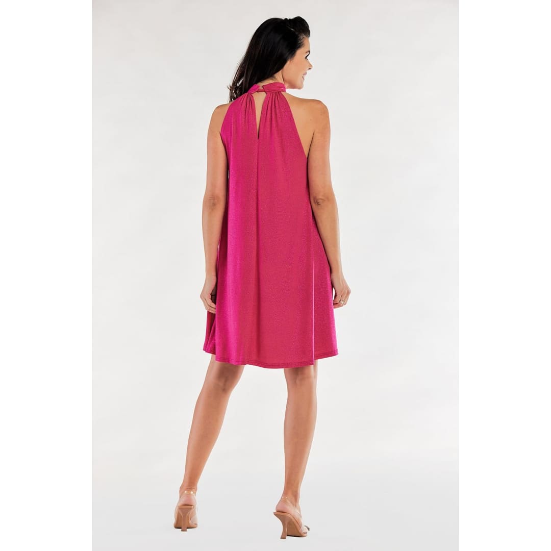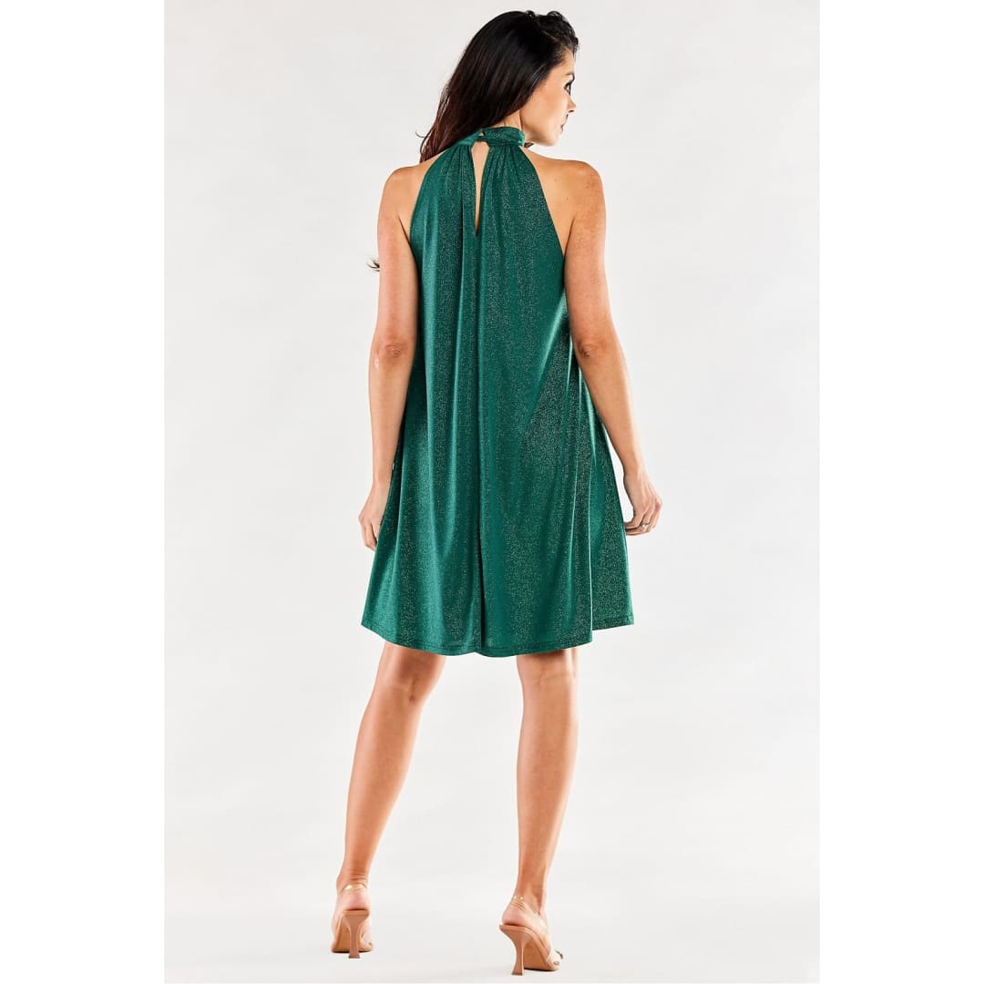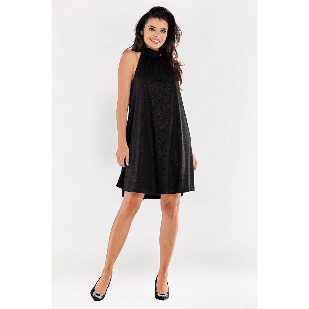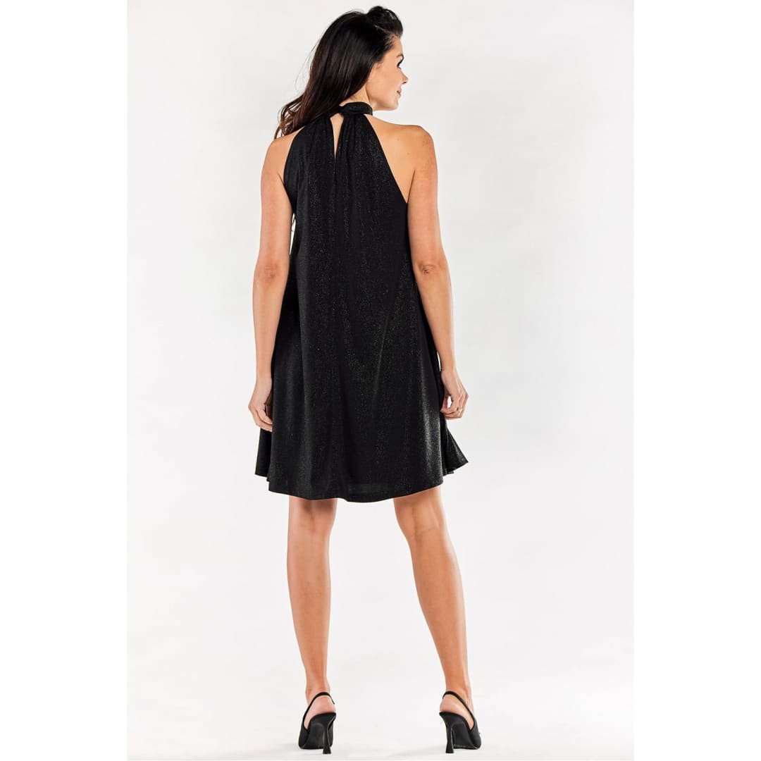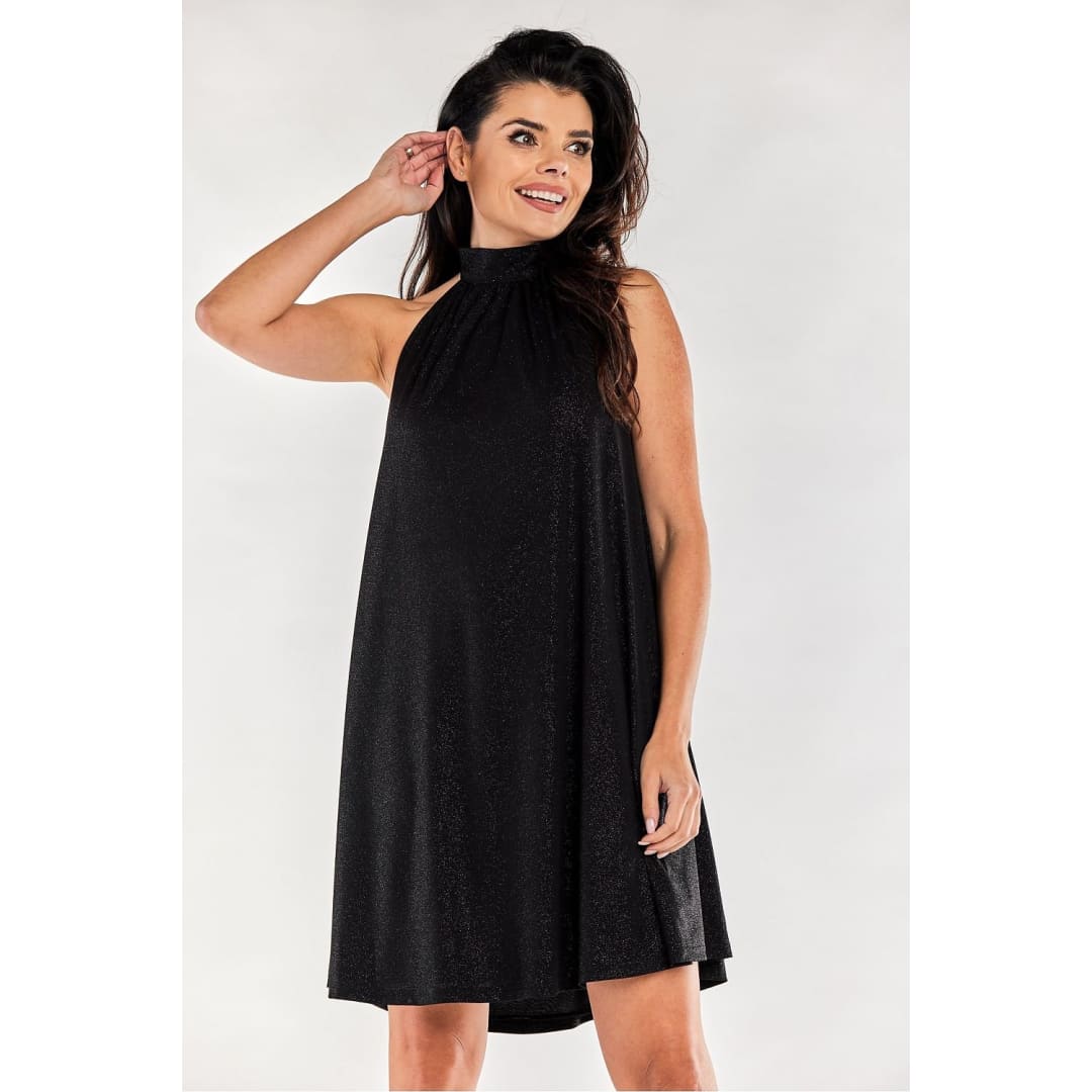 Short, flared dress with decorative neckline crease, on a buttoned collar. The dress is sewn on an elastic lining. The dress was manufactured in Poland.