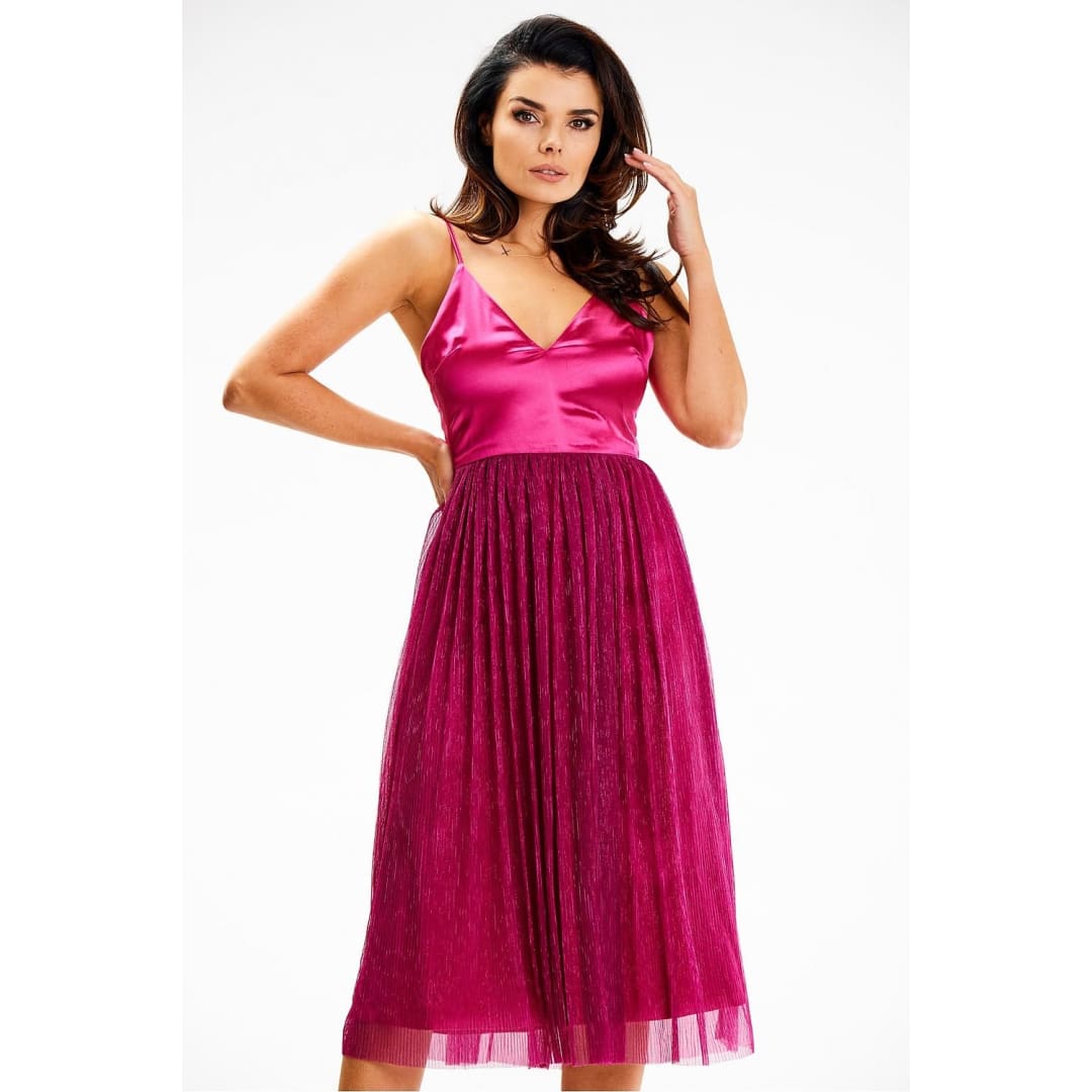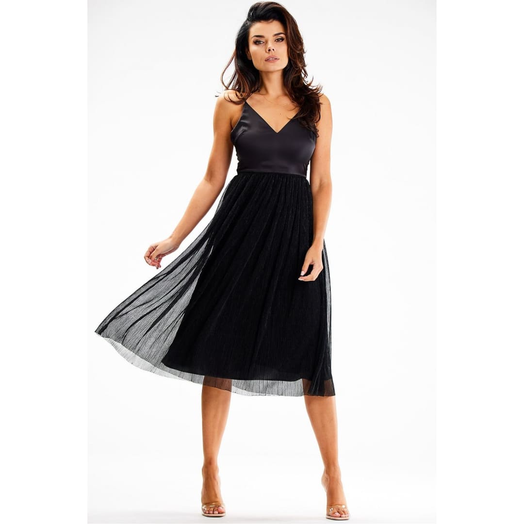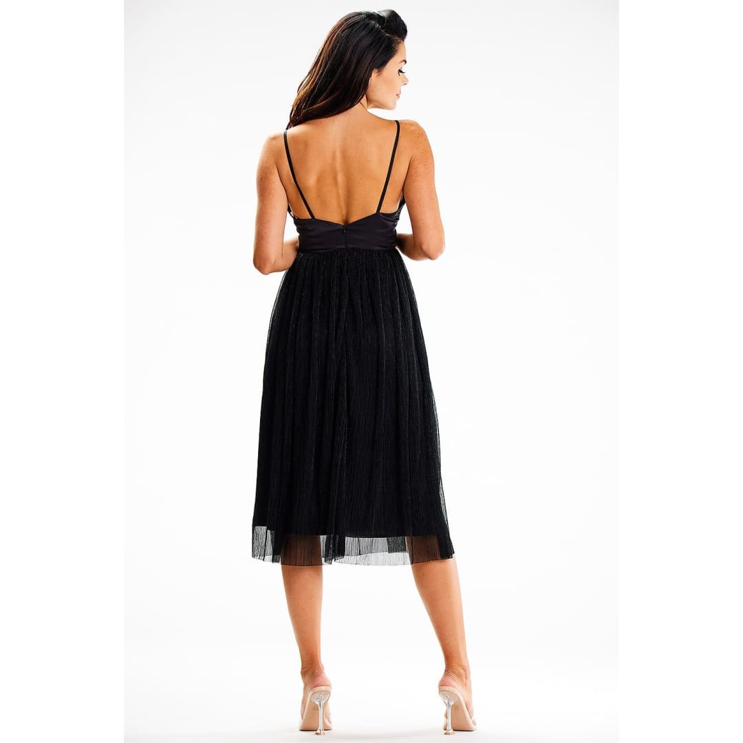 Midi dress with a fitted, satin strapless top that perfectly emphasizes the feminine curves. The flared bottom was made of shiny mesh on a lining.