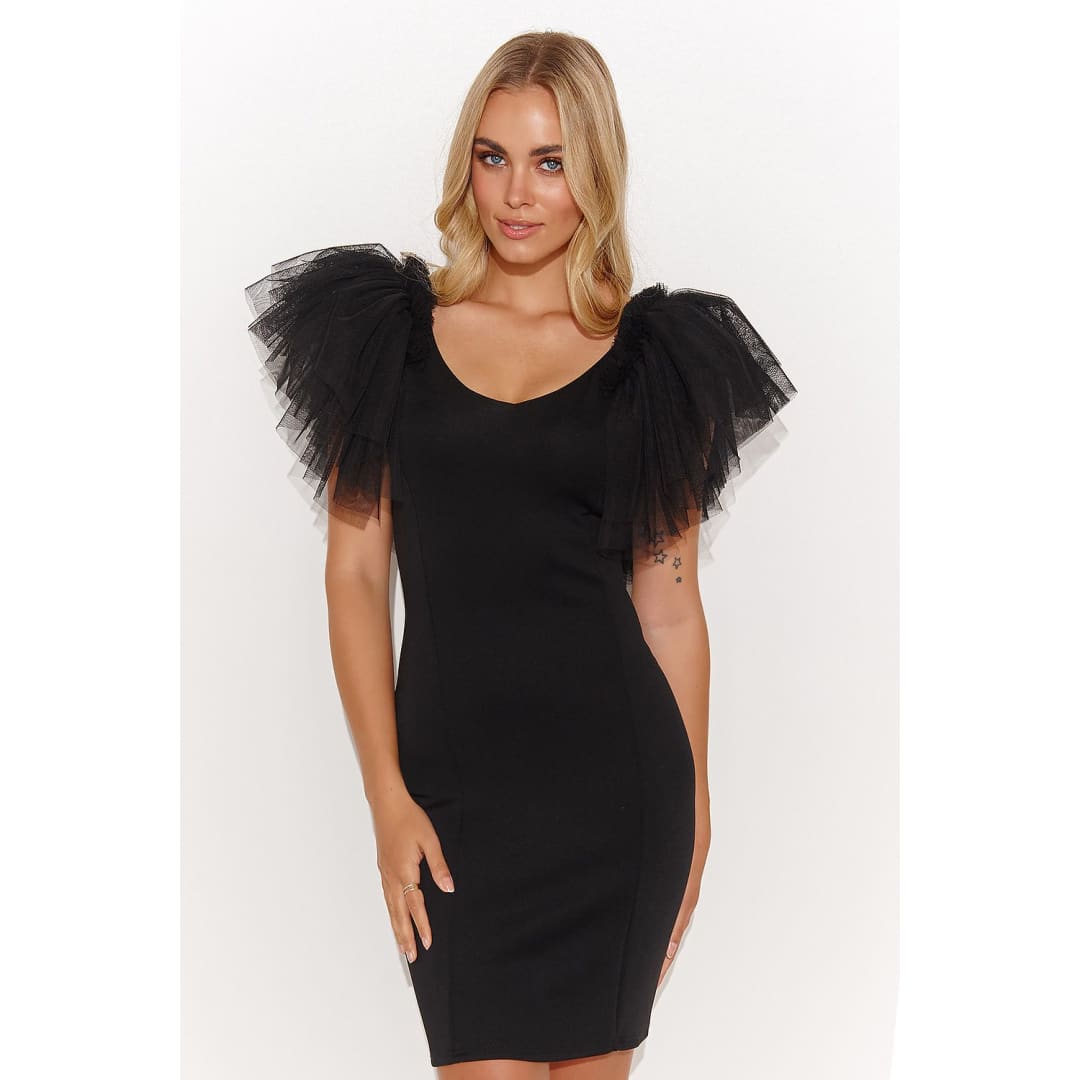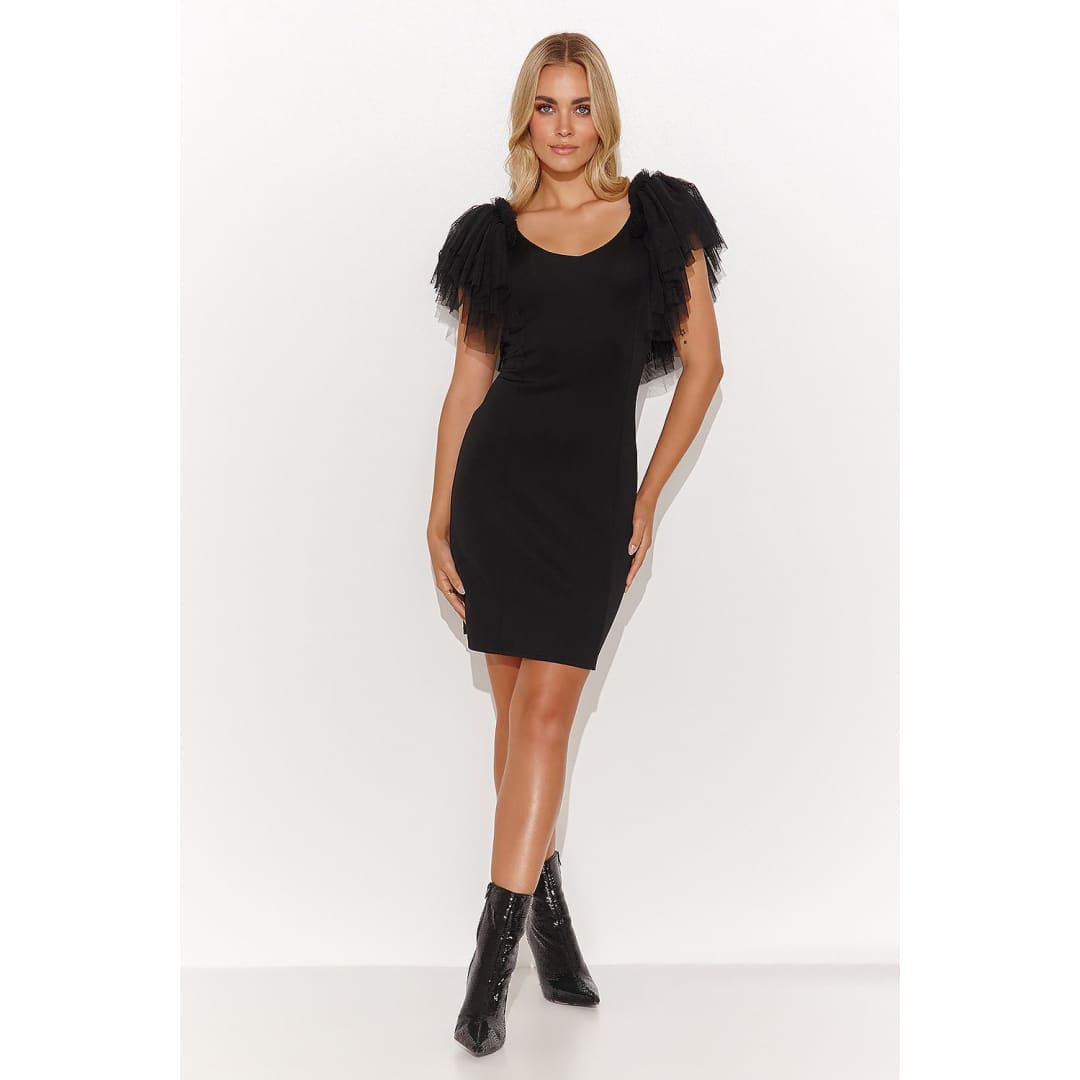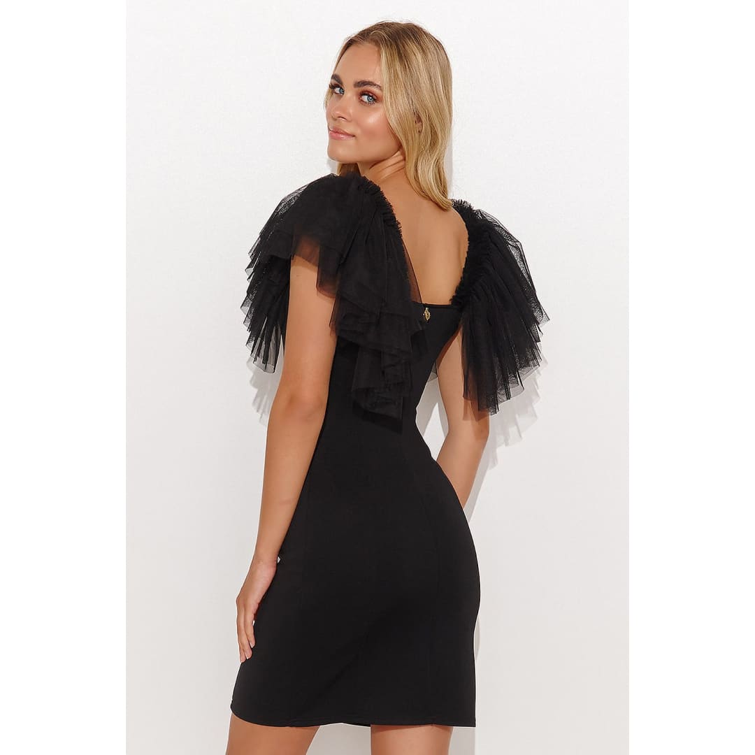 Discover your unique style with a highly sensual fitted black mini dress. This stunning creation, adorned with a gold tinsel accent, is the perfect choice for evening outings. Its open back and striking ruffles instead of traditional sleeves add extraordinary charm to the dress. The slightly rounded neckline on the front emphasizes the delicately feminine neck, creating a harmonious whole. This dress is a combination of elegance and sensuality, so it is a sensational choice for confident women ready to steal glances at every step. Wear small jewelry with it and enchant.