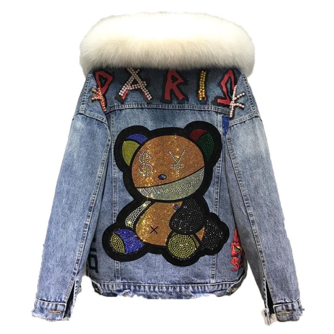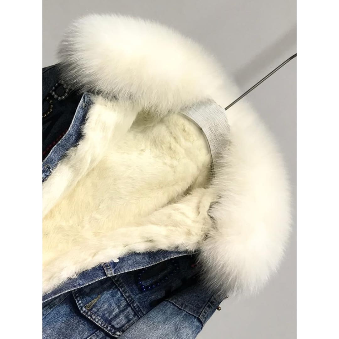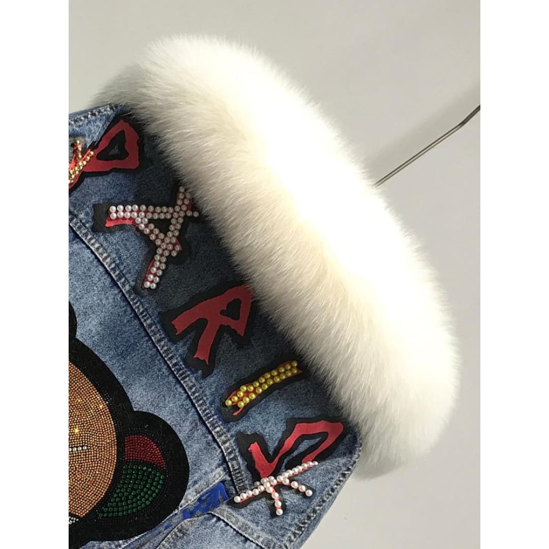 Introducing the FOXY LADY Beary Sequined Denim Jacket! This coat is a must-have and you surely will want it in your wardrobe. It is a super comfortable coat made out of real fur and looks incredibly fashionable. Perfect for adding to any street style look of your choice. This is a must have for showing off your swag! Made with real fox fur and rabbit lining to keep you feeling warm and snuggled.
