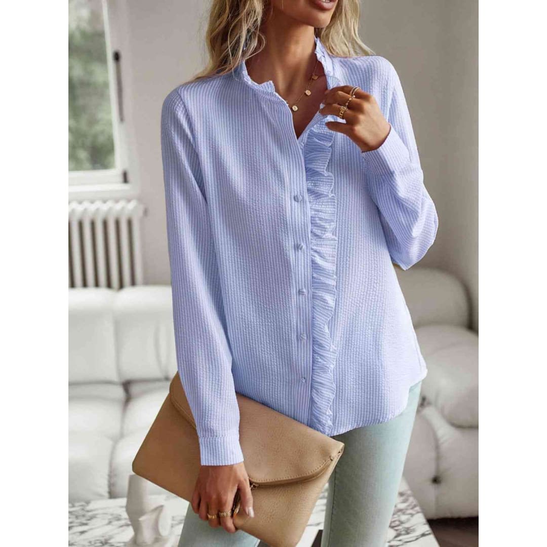 Flaunt a breezy, feminine vibe with our Nat Ruffle Trim Long Sleeve Shirt! This charming top is a breath of fresh air in your wardrobe, featuring delicate ruffle trim that adds a playful yet sophisticated touch. The long sleeves provide a graceful silhouette, making it perfect for both cooler days or as a statement piece under a blazer. Ideal for both a day at the office or a casual weekend outing, this shirt is a versatile must-have that pairs as beautifully with tailored trousers as it does with your favorite jeans. Let the Nat Ruffle Trim Shirt whisk you away with its effortless charm and stylish flair.