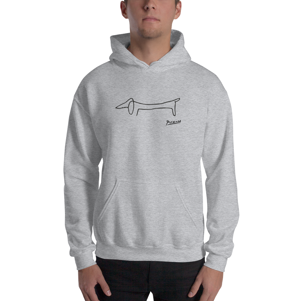 This amazing hoodie features a homage paid by Pablo Picasso to his self-assured little dachshund called Lump. While some old masters made a point of including the faces of fellow artists and patrons in the crowds portrayed in large oil paintings, the 'maestro' used to paint his little friend.