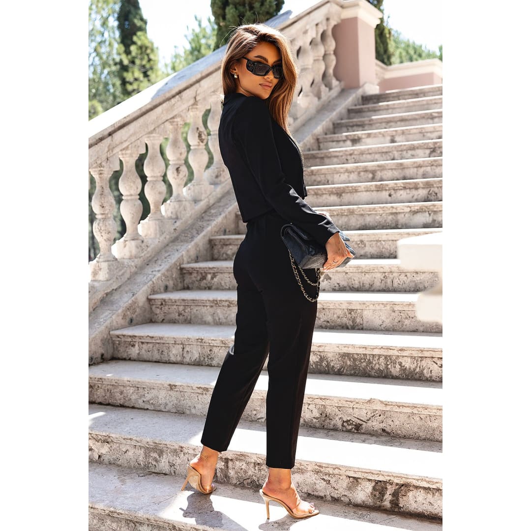 Total look, which is an extremely comfortable set, a short blazer buttoned with a golden button and tapered cigarette pants with a high waist and pockets. When the blazer is buttoned, it visually lengthens the neck, creating a V-shaped neckline with two lapels. It perfectly complements the outfit with dedicated pants, classic cigarette trousers tapering down with slip-in pockets. Made of firm, high-quality fabric. Durability is combined with a classic look and precise finish. Margo is a set for many seasons. Designed and made in Poland. The length of the trousers is measured inside the leg.