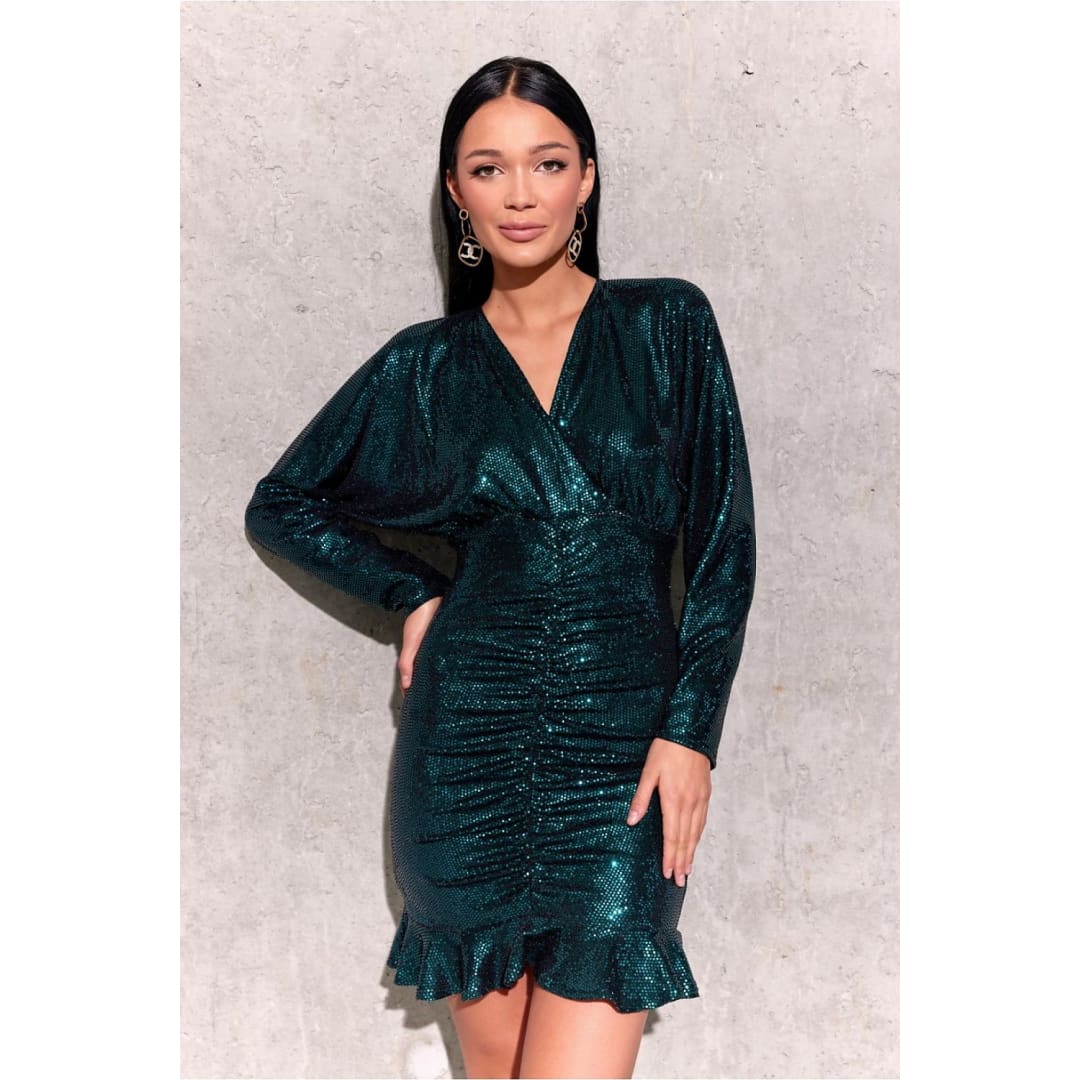 The sequin mini dress features an envelope neckline, a flared top that tapers at the sleeves and a fitted draped bottom. The fitted ruffled hem is finished with a charming ruffle throughout. The creases level out any imperfections. The length is before the knee. Fastened with a button at the back of the dress. This model guarantees a lot of freedom of movement, thanks to the flared sleeve top and exposed back. It will allow you to dance and have fun all night, while looking consistently stunning. The sequin dress gently and sensually reveals the back with which you will not be restrained and can go wild all night. Thanks to the careful finishing, elastic lining and hemmed edges, you can be sure that the sequins will not scratch your skin and pull your tights. The product is made and sewn in Poland.
